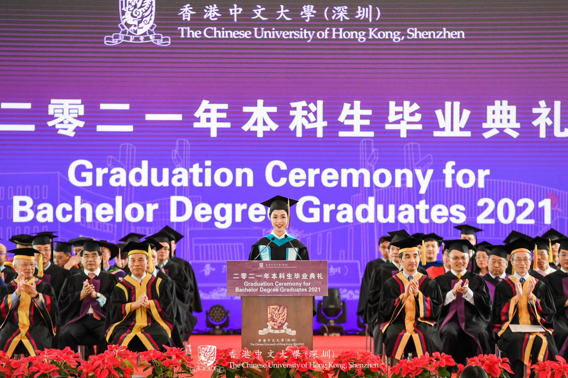 獲得“杰出學(xué)生獎(jiǎng)”的何澤翰同學(xué)代表全體畢業(yè)生發(fā)表感言?!案兄x學(xué)院里和藹可親的教授們給予了我們良好的學(xué)術(shù)指導(dǎo),讓我們了解了學(xué)術(shù)前沿,遇見包羅萬象的知識(shí);學(xué)校提供了各種創(chuàng)業(yè)平臺(tái)和指導(dǎo),讓我們可以實(shí)現(xiàn)自己的每一個(gè)夢(mèng)想和創(chuàng)意,并不斷提升個(gè)人軟實(shí)力,遇見燦若繁星的夢(mèng)想;香港中文大學(xué)(深圳)讓我們開闊了國際視野,遇見更為廣闊的世界;書院所營造的溫馨環(huán)境,助我們成為一個(gè)卓越的社會(huì)人,培養(yǎng)了我們的綜合素質(zhì),遇見煥然如新的自己?!?/p>