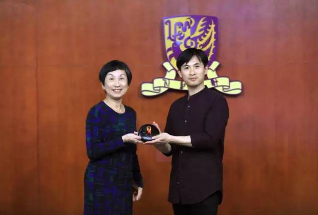 Ms. Dorothy Wong, Director of University Planning and Coordination Office, and Administrative Services Office, presented a customized souvenir to Mr. Doudou Huang.