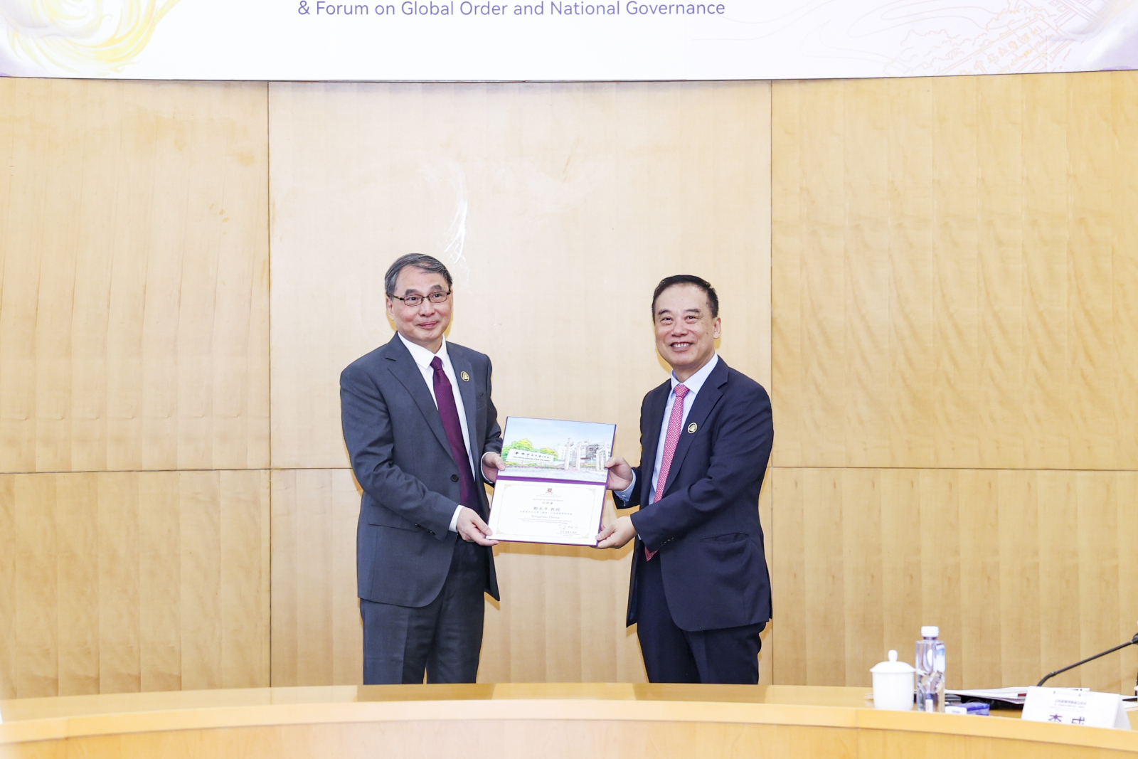 At the Forum on Global Order and National Governance held afterward, guests including Carrie Lam Cheng Yuet-ngor, Long Yongtu, Lawrence J. Lau, and Qiu Baoxing, academician of the International Eurasian Academy of Sciences and former deputy minister of Housing and Urban-Rural Development, delivered keynote speeches.