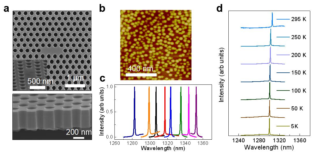 Prof. Zhaoyu Zhang`s group from the School of Science and Engineering and their collaborators designed the epitaxial structure of silicon-based quantum dot photonic crystal lasers and molecular-beam epitaxy (BME) was used to directly grow high-quality InAs quantum dots on silicon as the gain medium of the laser. Relying on the support from Shenzhen Key Lab of Semiconductor Lasers established in recent years, Prof. Zhaoyu Zhang`s group fabricated and tested the sub-wavelength scale photonic crystal lasers for the first time. The laser chips operate at room temperature under continuous-wave optical pumping. Single-mode lasing emission at 1310 nm optical communication band was achieved as shown in Figure 2.