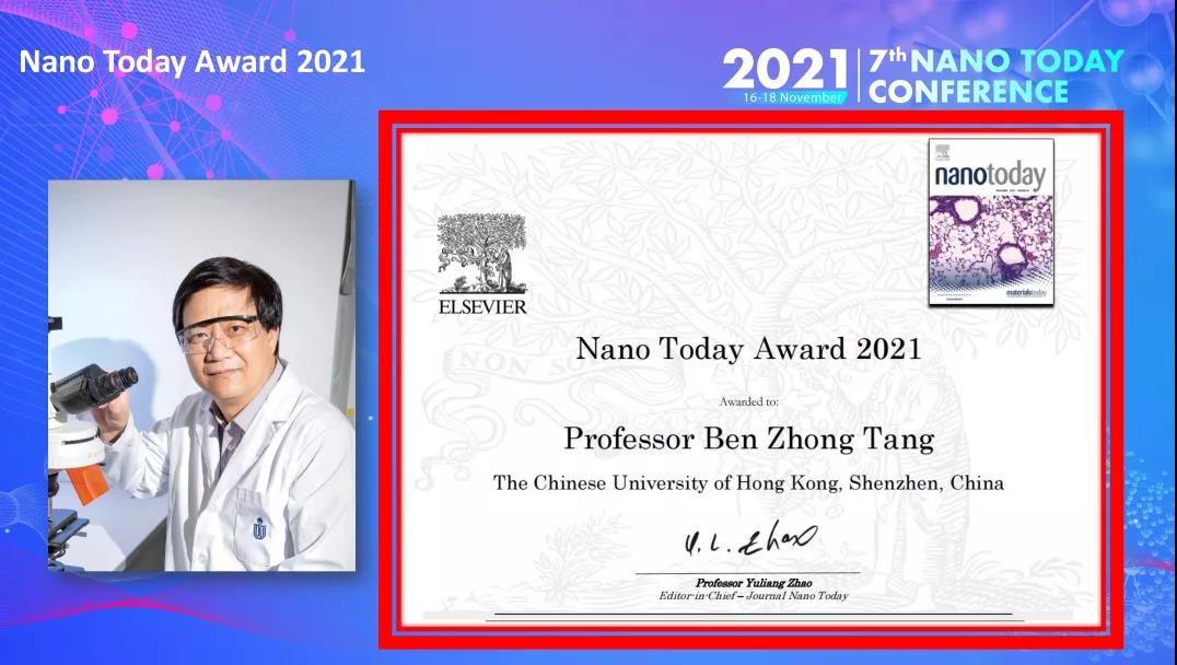 Prof. Benzhong Tang, Member of the Chinese Academy of Sciences and Dean of the School of Science and Engineering, CUHK-Shenzhen was awarded the Nano Today Award 2021 at the 7th Nano Today Conference. The award is in recognition of his pioneering research on nanostructured materials. Dean Tang is the first scientist in the Chinese academic sector to receive the Award since its establishment.