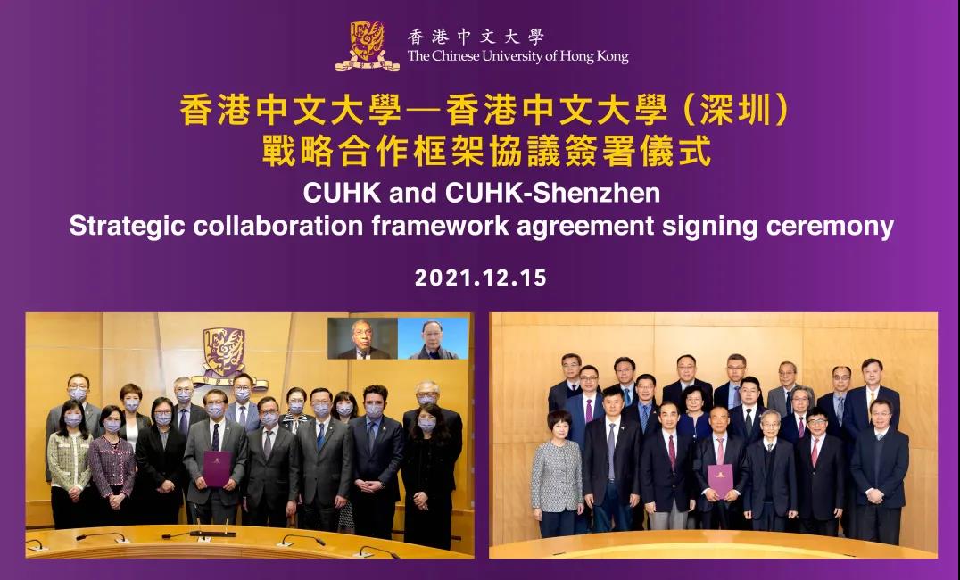 On 15 December 2021, CUHK-Shenzhen and The Chinese University of Hong Kong (CUHK) entered into a new Strategic Collaboration Framework Agreement, taking this important partnership to the next level. CUHK-Shenzhen and CUHK will jointly explore a new model for the integrated development of higher education, talents, research and medicine between Shenzhen and Hong Kong, which will contribute to the prosperous advancement of the Guangdong-Hong Kong-Macao Greater Bay Area and the nation more broadly.