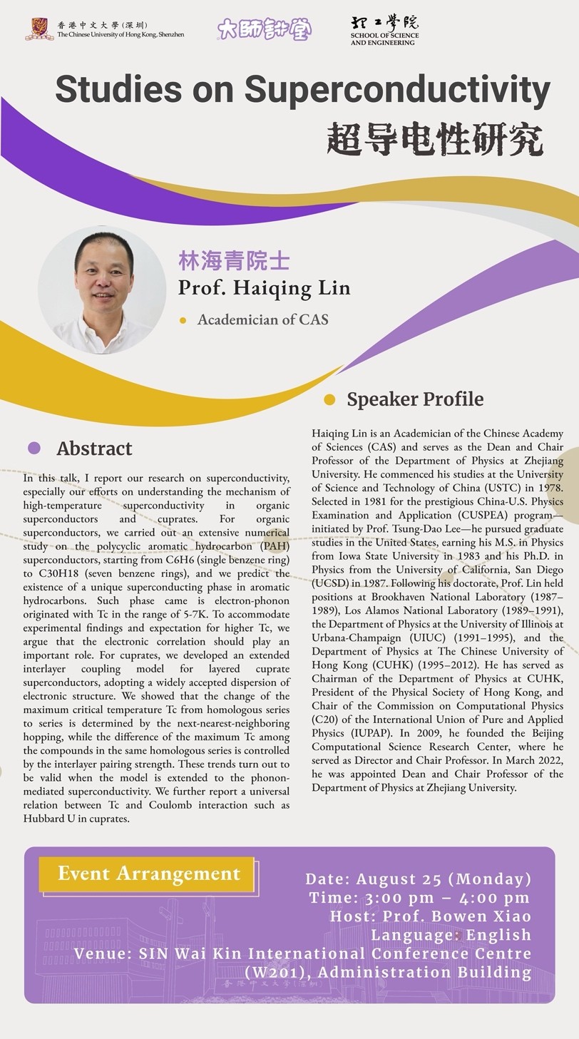 Haiqing Lin is an Academician of the Chinese Academy of Sciences (CAS) and serves as the Dean and Chair Professor of the Department of Physics at Zhejiang University. He commenced his studies at the University of Science and Technology of China (USTC) in 1978. Selected in 1981 for the prestigious China-U.S. Physics Examination and Application (CUSPEA) program—initiated by Prof. Tsung-Dao Lee—he pursued graduate studies in the United States, earning his M.S. in Physics from Iowa State University in 1983 and his Ph.D. in Physics from the University of California, San Diego (UCSD) in 1987. Following his doctorate, Prof. Lin held positions at Brookhaven National Laboratory (1987–1989), Los Alamos National Laboratory (1989–1991), the Department of Physics at the University of Illinois at Urbana-Champaign (UIUC) (1991–1995), and the Department of Physics at The Chinese University of Hong Kong (CUHK) (1995–2012). He has served as Chairman of the Department of Physics at CUHK, President of the Physical Society of Hong Kong, and Chair of the Commission on Computational Physics (C20) of the International Union of Pure and Applied Physics (IUPAP). In 2009, he founded the Beijing Computational Science Research Center, where he served as Director and Chair Professor. In March 2022, he was appointed Dean and Chair Professor of the Department of Physics at Zhejiang University.