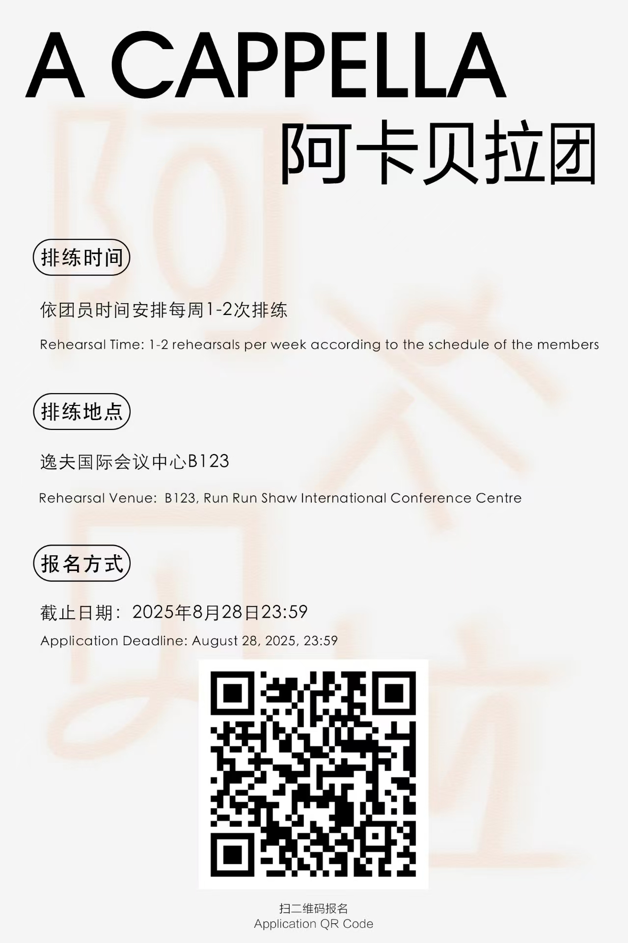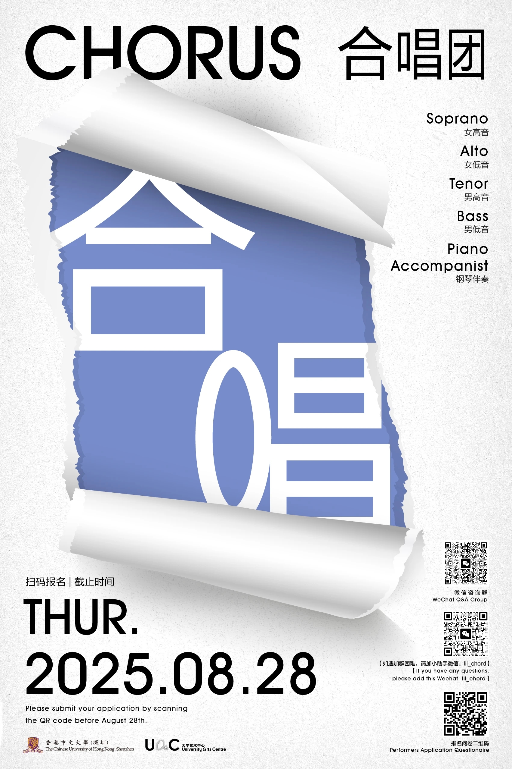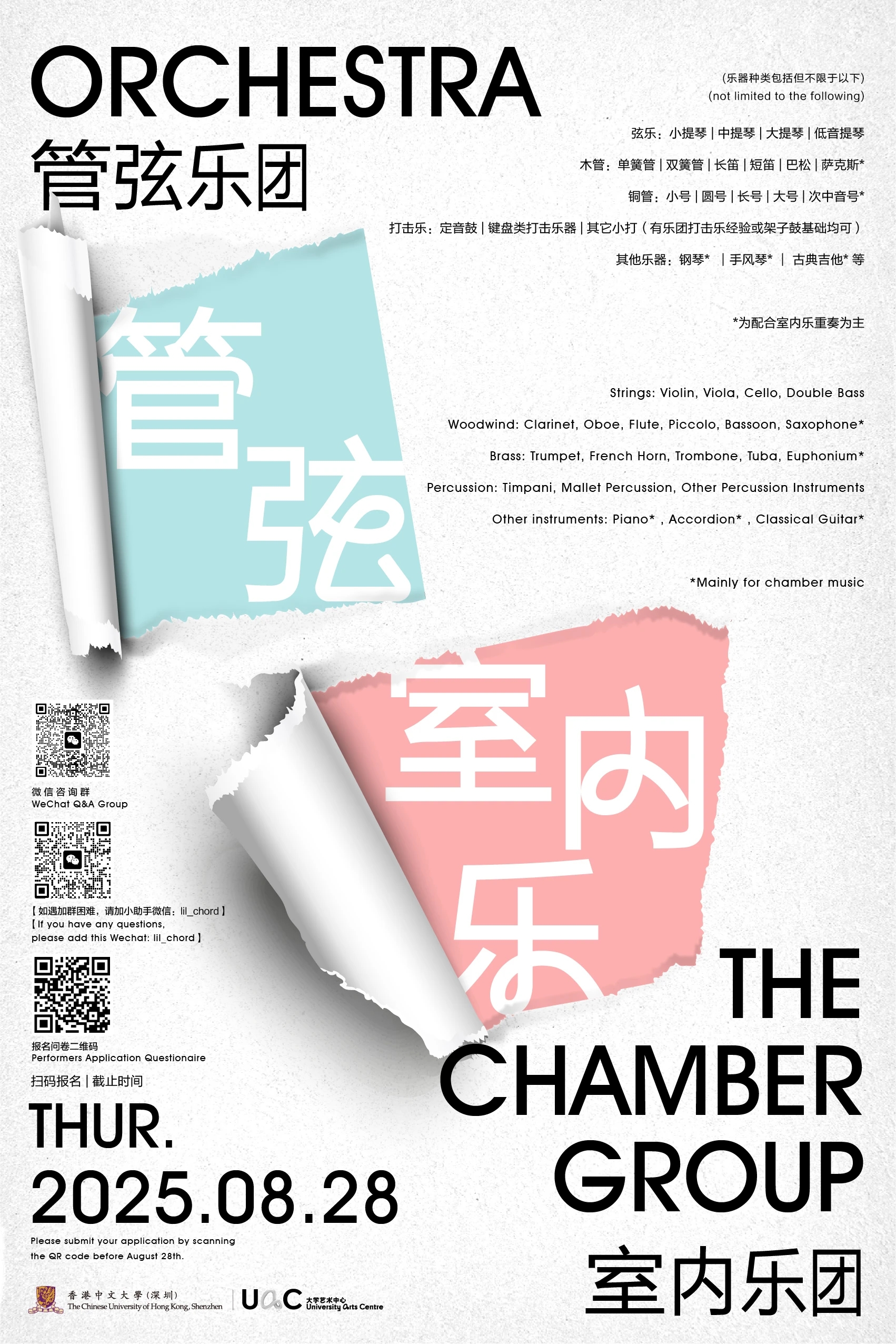 2025 CUHK(SZ) Art Groups Recruitment is officially Open Now! We welcome vocal talents, instrumental virtuoso, or music innovation enthusiasts to join us in creating a brilliant symphony. You could scan the QR code to join the Art Groups Recruitment Information Group. The senior students in the group will be happy to answer any questions you have about the recruitment process! (If you have trouble joining the group, please add our assistant on WeChat for help. WeChat ID: lil_chord)