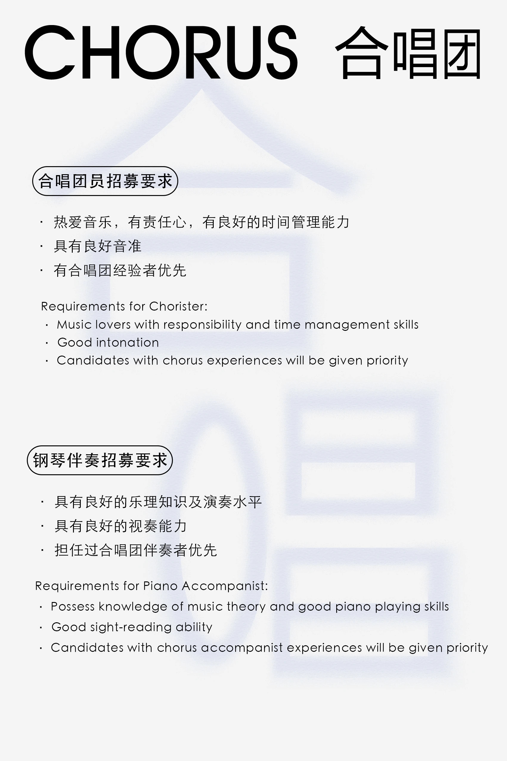 The Chorus of The Chinese University of Hong Kong, Shenzhen was formerly the CUHK-Shenzhen Student Chorus (established in 2014) and the CUHK-Shenzhen Staff Chorus (established in ?2015). In 2019, the two choruses were officially merged into a university-level chorus. Since its establishment, adhering to the concept of innovation and diversification, it has participayed in nearly 40 concerts and large-scale performances at home and abroad, rehearsed a large number of classic chorus repertories, and collaborated with numerous outstanding musicians and musical groups such as DAI Yuqiang, Warren MOK, WEI Song, GAO Song, WU Bixia, Anson PING, LIU Yan, Rose LIU, Tiago NACARATO, Eliseu SILVA, the Hong Kong Strings, the Shenzhen Symphony Orchestra, the Guangdong Chinese Orchestra, and more.