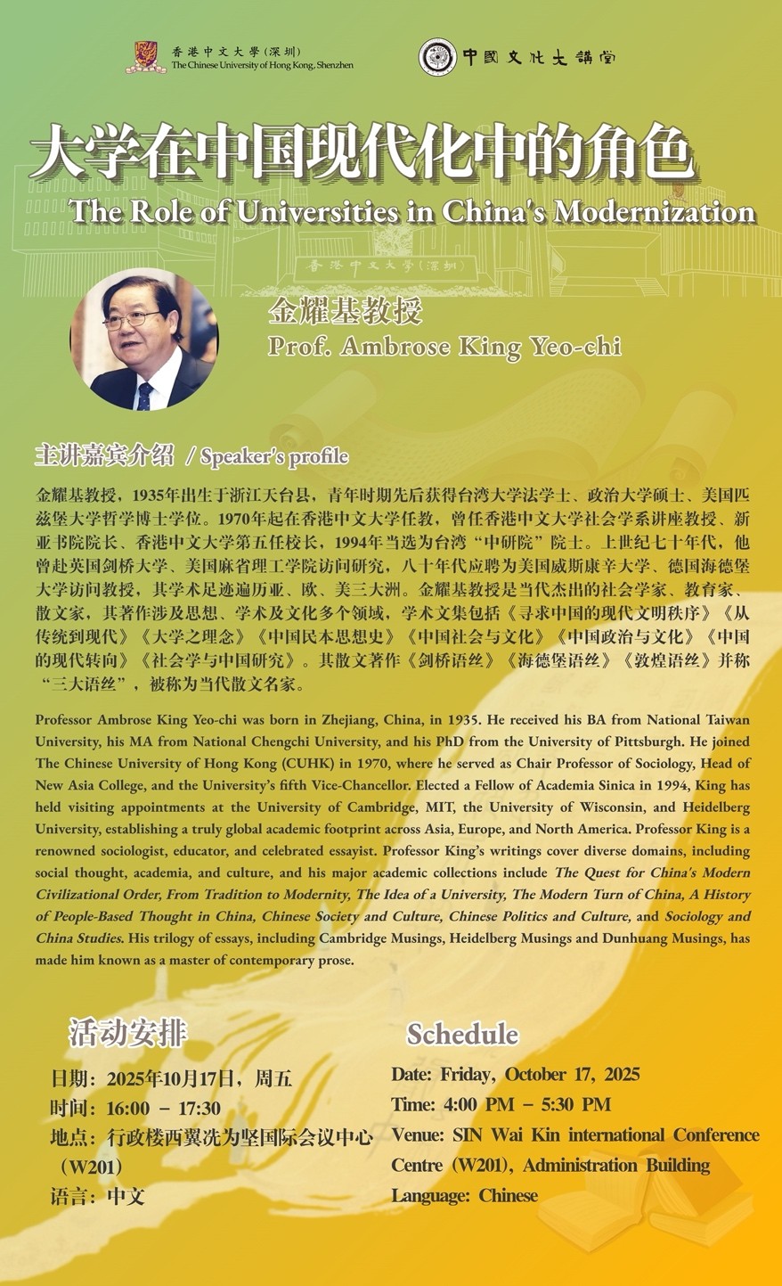 Professor Ambrose King Yeo-chi was born in Zhejiang, China, in 1935. He received his BA from National Taiwan University, his MA from National Chengchi University, and his PhD from the University of Pittsburgh. He joined The Chinese University of Hong Kong (CUHK) in 1970, where he served as Chair Professor of Sociology, Head of New Asia College, and the University’s fifth Vice-Chancellor. Elected a Fellow of Academia Sinica in 1994, King has held visiting appointments at the University of Cambridge, MIT, the University of Wisconsin, and Heidelberg University, establishing a truly global academic footprint across Asia, Europe, and North America. Professor King is a renowned sociologist, educator, and celebrated essayist. Professor King’s writings cover diverse domains, including social thought, academia, and culture, and his major academic collections include The Quest for China's Modern Civilizational Order, From Tradition to Modernity, The Idea of a University, The Modern Turn of China, A History of People-Based Thought in China, Chinese Society and Culture, Chinese Politics and Culture, and Sociology and China Studies. His trilogy of essays, including Cambridge Musings, Heidelberg Musings and Dunhuang Musings, has made him known as a master of contemporary prose.