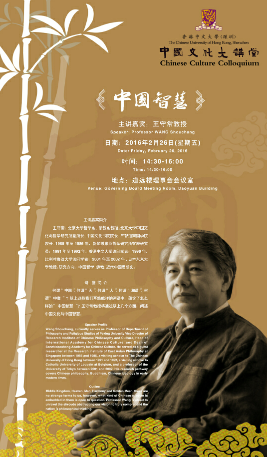 Speaker Profile:?Wang Shouchang, currently serves as Professor of Department of Philosophy and Religious Studies of Peking University Vice Director of Research Institute of Chinese Philosophy and Culture, Head of International Academy for Chinese Culture, and Dean of Sanzhidaoshang Academy for Chinese Culture. He served as a guest researcher at the Research Institute of East Asian Philosophy at Singapore between 1985 and 1986, a visiting scholar to The Chinese University of Hong Kong between 1991 and 1992, a visiting scholar to Catholic University of Louvain at Belgium, and a professor of the University of Tokyo between 2001 and 2002. His research pathway covers Chinese philosophy, Buddhism, Chinese ideology in early modern times.