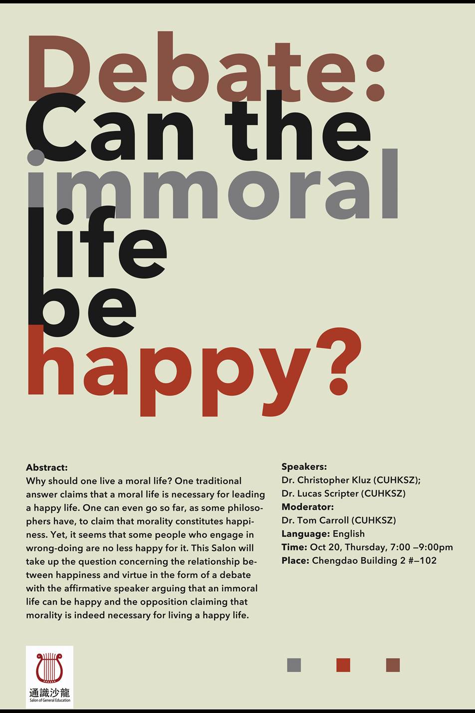 Why should one live a moral life? One traditional answer claims that a moral life is necessary for leading a happy life. One can even go so far, as some philosophers have,?to claim that morality constitutes happiness. Yet, it seems that some people who engage in wrong-doing are no less happy for it. This Salon will take up the?question concerning the relationship between happiness and virtue in the form of a debate with the affirmative speaker arguing that an immoral life can be happy and the opposite speaker claiming that morality is indeed necessary for living a happy life.