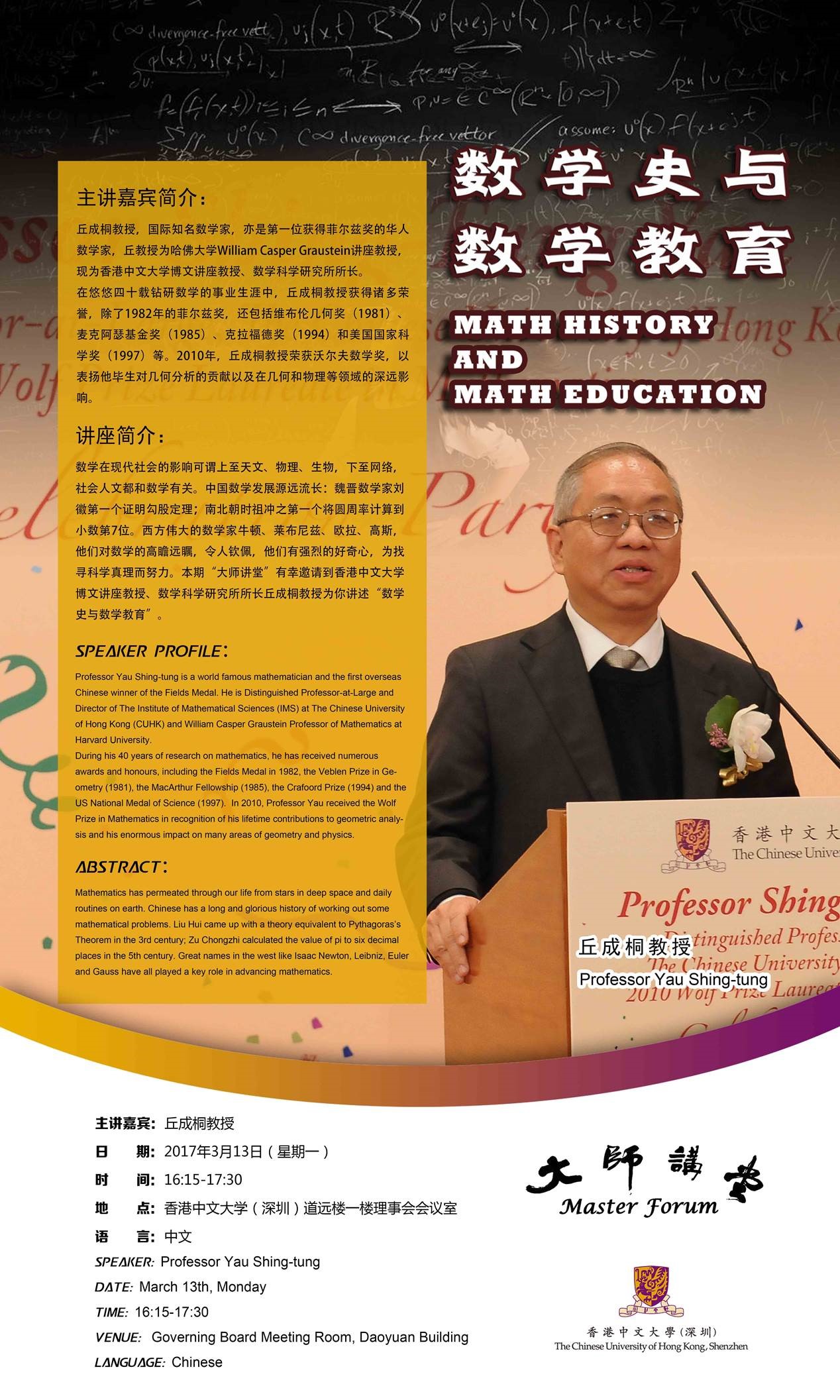 Professor Yau Shing-tung is a world famous mathematician and the first overseas Chinese winner of the Fields Medal. He is Distinguished Professor-at-Large and Director of The Institute of Mathematical Sciences (IMS) at The Chinese University of Hong Kong (CUHK) and William Casper Graustein Professor of Mathematics at Harvard University.?During his 40 years of research on mathematics, he has received numerous awards and honours, including the Fields Medal in 1982, the Veblen Prize in Geometry (1981), the MacArthur Fellowship (1985), the Crafoord Prize (1994) and the US National Medal of Science (1997).? In 2010, Professor Yau received the Wolf Prize in Mathematics in recognition of his lifetime contributions to geometric analysis and his enormous impact on many areas of geometry and physics.