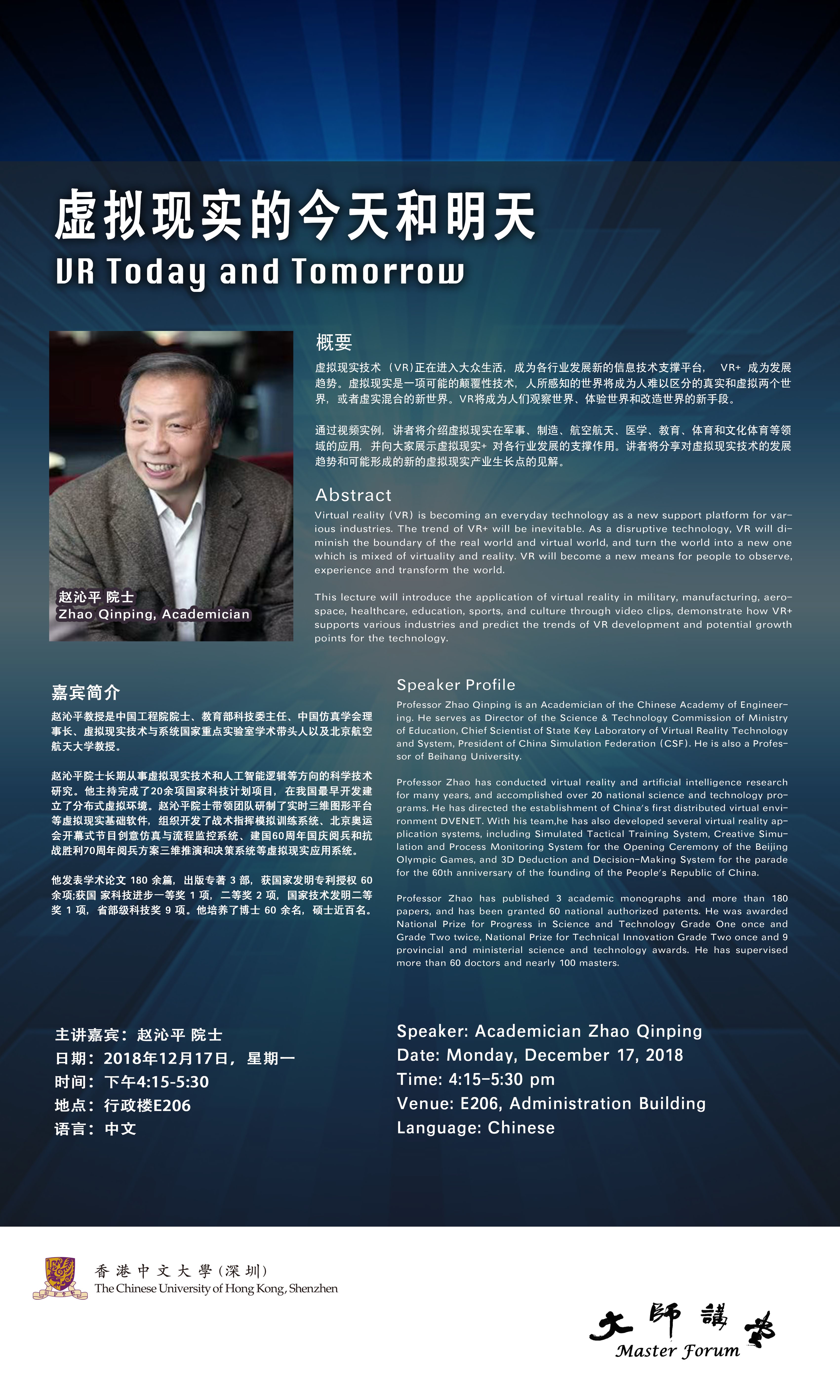 This lecture will introduce the application of virtual reality in military, manufacturing, aerospace, healthcare, education, sports, and culture through video clips, demonstrate how VR+ supports various industries and predict the trends of VR development and potential growth points for the technology.