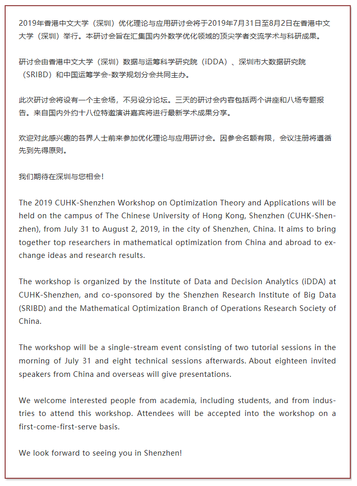 The 2019 CUHK-Shenzhen Workshop on Optimization Theory and Applications