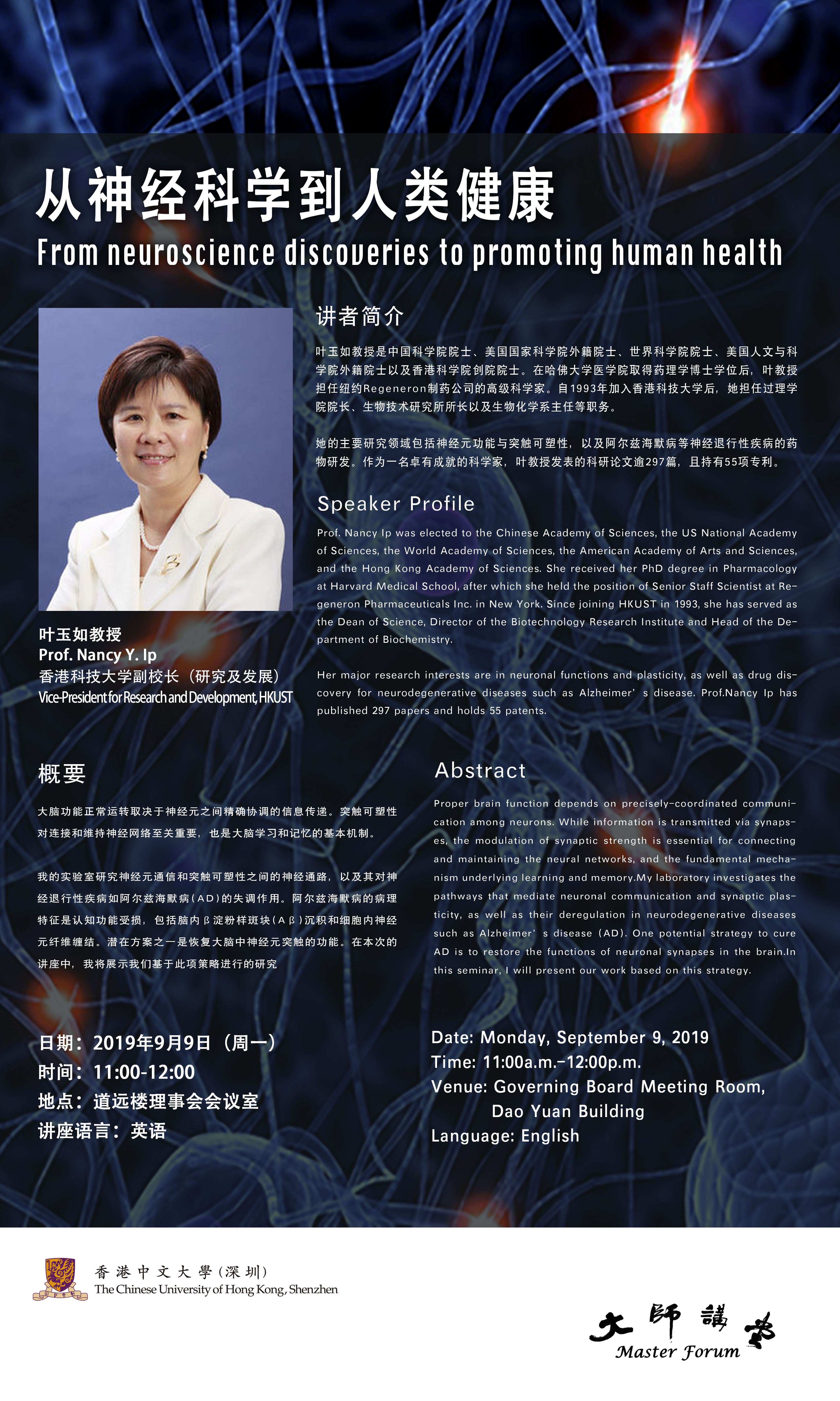 ??????? Prof.Nancy Ip is Vice-President for Research and Development, the Morningside Professor of Life Science, Director of the State Key Laboratory of Molecular Neuroscience,?HKUST. Prof.Nancy Ip was elected to the Chinese Academy of Sciences, the US National Academy of Sciences, the World Academy of Sciences, the American Academy of Arts and Sciences, and the Hong Kong Academy of Sciences.?She received her PhD degree in Pharmacology at Harvard Medical School, after which she held the position of Senior Staff Scientist at Regeneron Pharmaceuticals Inc. in New York. Since joining HKUST in 1993, she has served as the Dean of Science, Director of the Biotechnology Research Institute and Head of the Department of Biochemistry.