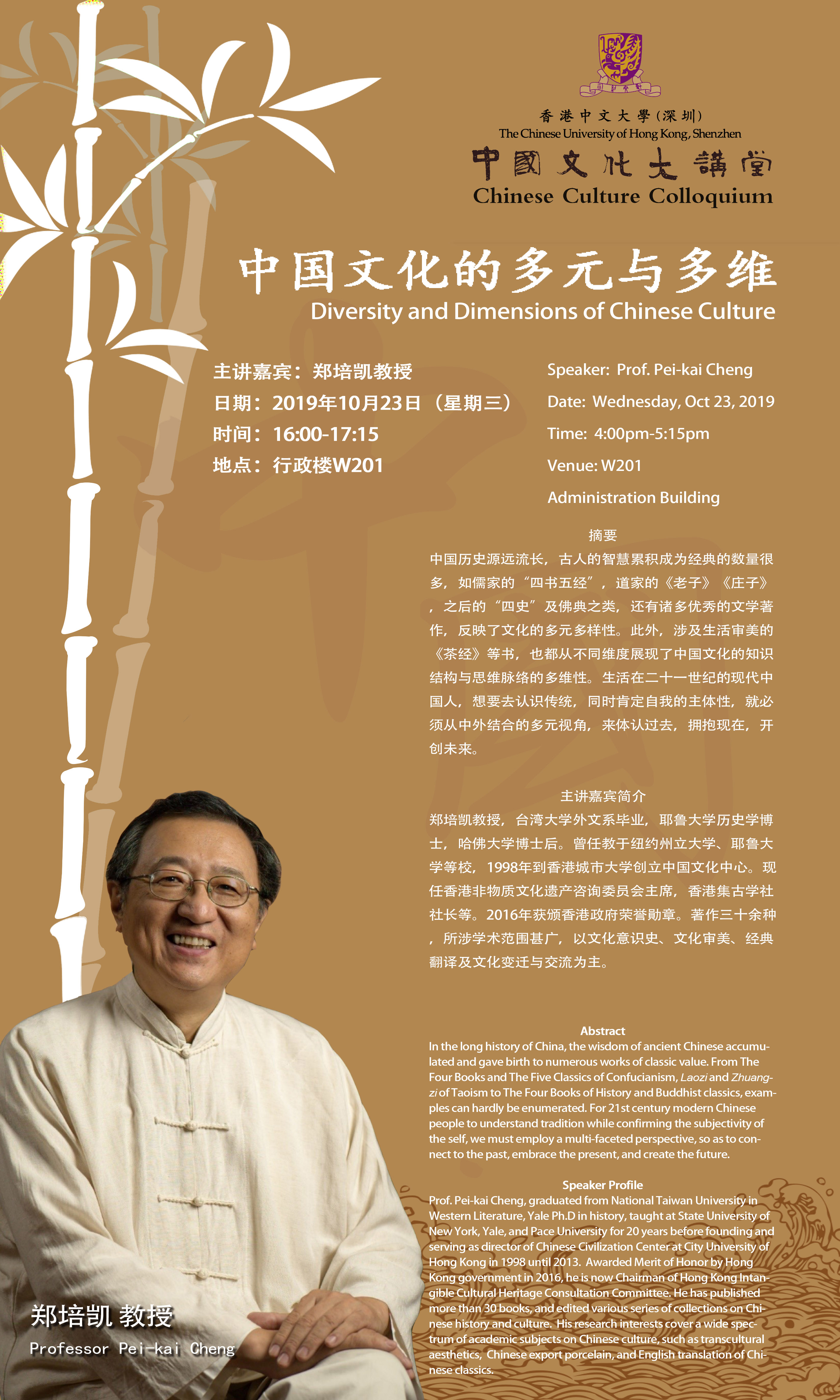 ? ? ? ? Prof. Pei-kai Cheng, graduated from National Taiwan University in Western Literature, Yale Ph.D in history, taught at State University of New York, Yale, and Pace University for 20 years before founding and serving as director of Chinese Civilization Center at City University of Hong Kong in 1998 until 2013. Since then he has been a visiting professor at Zhejiang University and University Professor at Fengjia University in Taiwan. Awarded Merit of Honor by Hong Kong government in 2016, he is now Chairman of Hong Kong Intangible Cultural Heritage Consultation Committee.