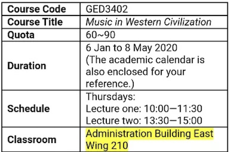 The masterpieces written by Bach, Handel, Haydn, Mozart, Beethoven, Schubert, Schumann, Brahms, etc will be introduced and discussed as relating to their socio-cultural background. Moving into the diversified 20th century, different styles such as Nationalism, Impressionism, Expressionism, Minimalism, Abstract Art and pop culture in the western world will also be discussed.