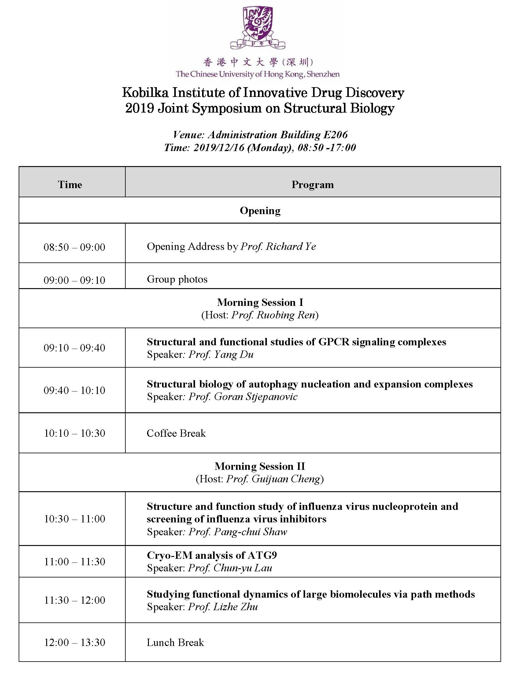 The goal of the symposium is to bring together leading scientists, researchers, and practitioners from life science to exchange ideas in structural biology. The topics will cover the structures of GPCRs, virus, autophagy, enzymes using crystallography, cryo-electron microscopy and computational methods. Sessions of keynote speech will be carried out, to be followed by free communication and coffee break.