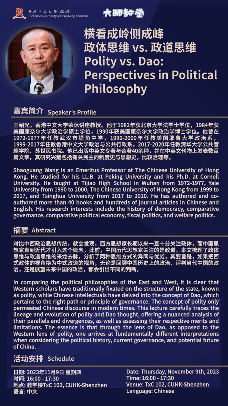 On 9 November at 4pm, The Chinese University of Hong Kong (Shenzhen) is honoured to welcome Professor Wang Shaoguang, Emeritus Professor of the Chinese University of Hong Kong, to the Master Forum. He will give a speech on the topic of "Polity vs. Dao: Perspectives in Political Philosophy ."