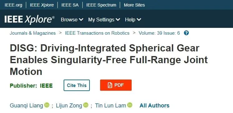 2023年12月,IEEE T-RO在線發表題為“DISG: Driving-Integrated Spherical Gear Enables Singularity-Free Full-Range Joint Motion”的論文。該論文提出了一個新穎的驅動集成球形齒輪結構并討論了其作為靈巧關節的特性。香港中文大學(深圳)博士生梁冠琪為論文第一作者,林天麟教授為論文獨立通訊作者。