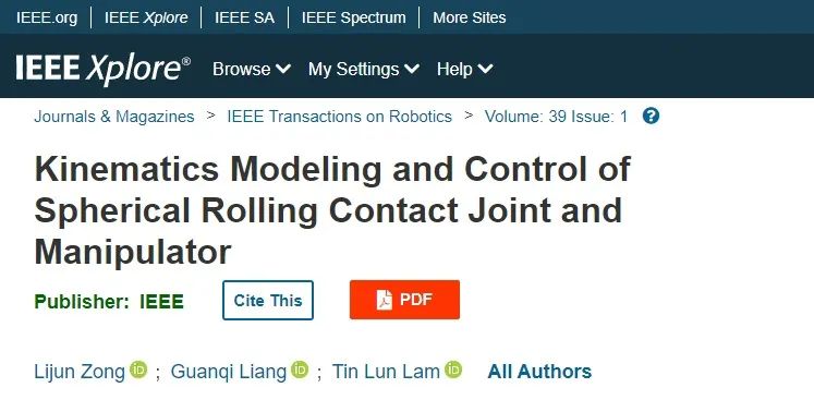 2023年2月,IEEE T-RO在線發表題為“Kinematics Modeling and Control of Spherical Rolling Contact Joint and Manipulator”的論文。該論文首次提出并討論了球形滾動接觸運動。香港中文大學(深圳)博士后宗立軍為論文第一作者,林天麟教授為論文獨立通訊作者。