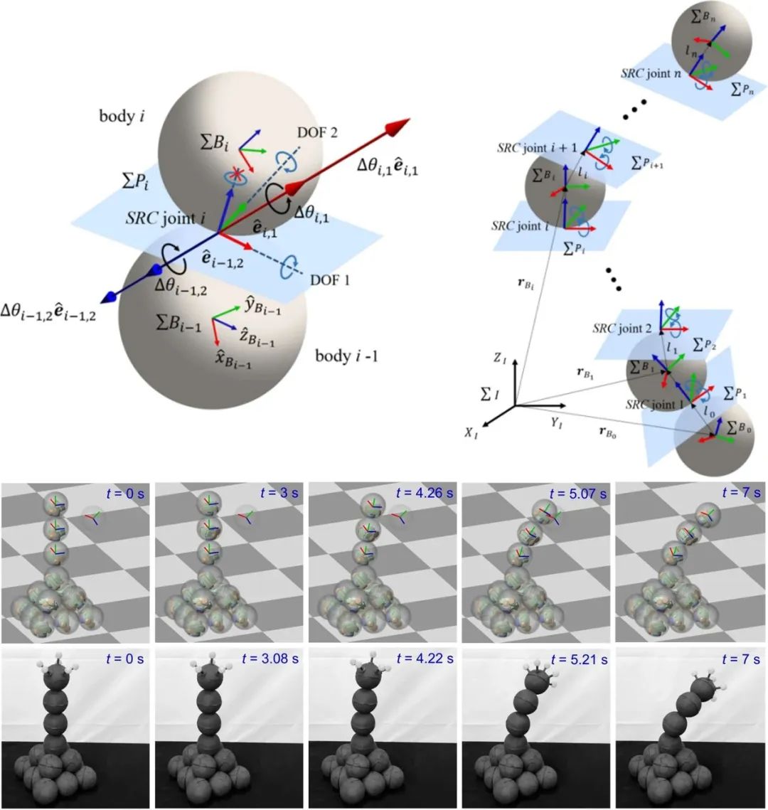 滾動點接觸運動因其減小磨料磨損、擴大構型空間、簡化控制器設計等優勢而被廣泛應用于球形機器人、多指機器人手、機械臂關節等運動系統。然而,目前關于圓形滾動點接觸(CRC)關節的研究僅限于1-DOF。本文引入了兩個滾動點接觸運動球之間的虛擬切平面概念,通過四元數和軸-角表示,簡明扼要地描述了SRC關節的運動,并建立了SRC關節的所有模型要素,包括旋轉矩陣、位置向量和自由模態等。利用SRC關節模型和阻尼最小二乘法等方法,系統規范地建立了SRC關節機械臂的正逆運動學方程。