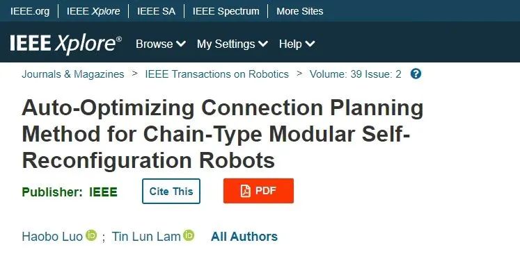 2023年4月,IEEE T-RO在線發表題為“Auto-Optimizing Connection Planning Method for Chain-Type Modular Self-Reconfiguration Robots”的論文。該論文提出了鏈式模塊化機器人的一種連接規劃方法。香港中文大學(深圳)博士生羅浩波為論文第一作者,林天麟教授為論文獨立通訊作者。