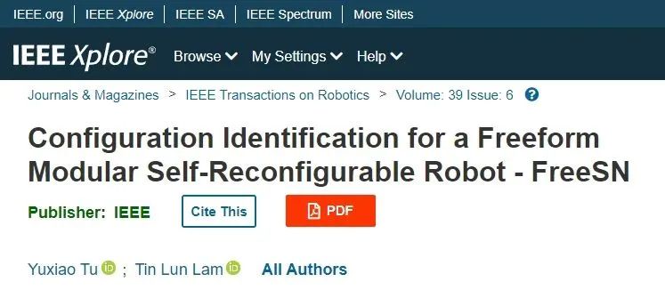 2023年12月,IEEE T-RO在線發表題為“Configuration Identification for a Freeform Modular Self-reconfigurable Robot – FreeSN”的論文。該論文提出了一個自由連接及桁架結構的模塊化自重構機器人系統,并實現了其構型感知功能。香港中文大學(深圳)博士生涂宇嘯為論文第一作者,林天麟教授為論文獨立通訊作者。