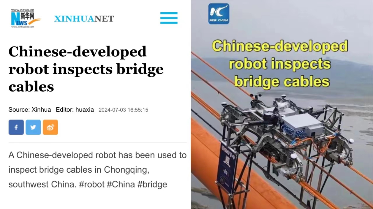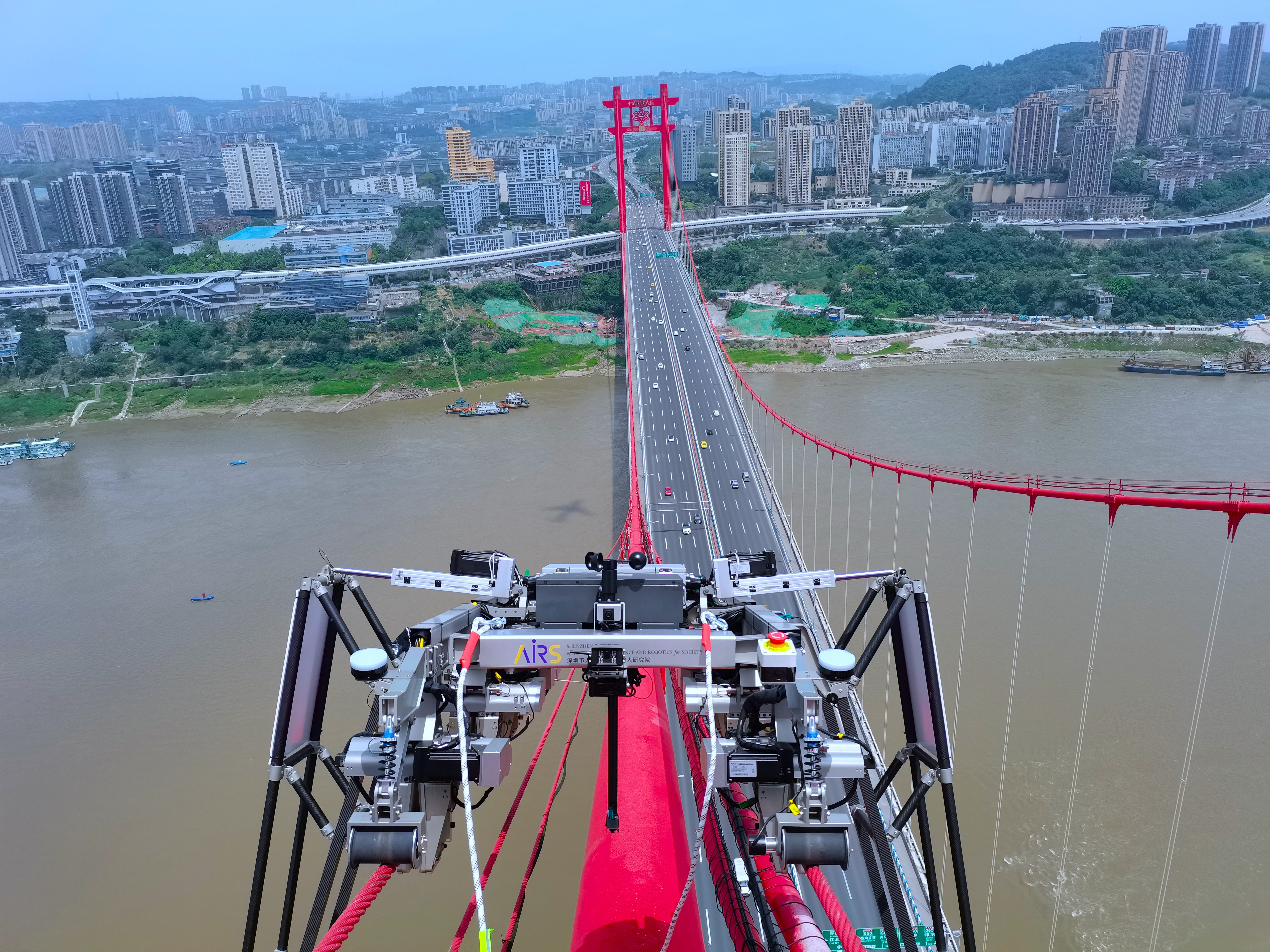 近日,新華社在其海外社交媒體平臺(X、Facebook、YouTube)及新華網海外版上報道了由深圳市人工智能與機器人研究院研發的主纜檢測機器人“攀登者號”(CCRobot-M)在重慶寸灘長江大橋開展智能化檢測。