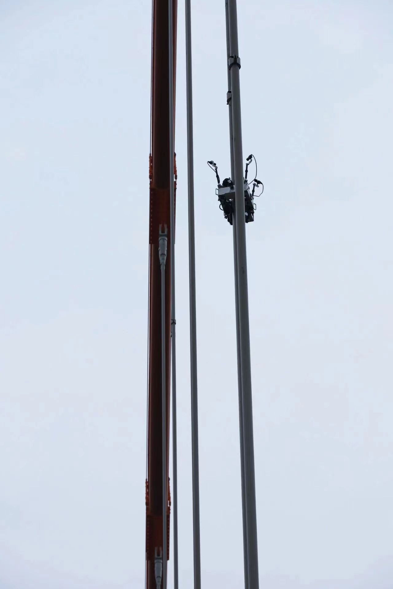 繼在郭家沱長江大橋邊跨主纜爬行登頂后,“攀登者號”此行攻克橋梁中跨主纜,順利登頂索塔。據現有公開資料,這是國際上首款沿主纜登頂索塔的機器人,填補了業內空白。