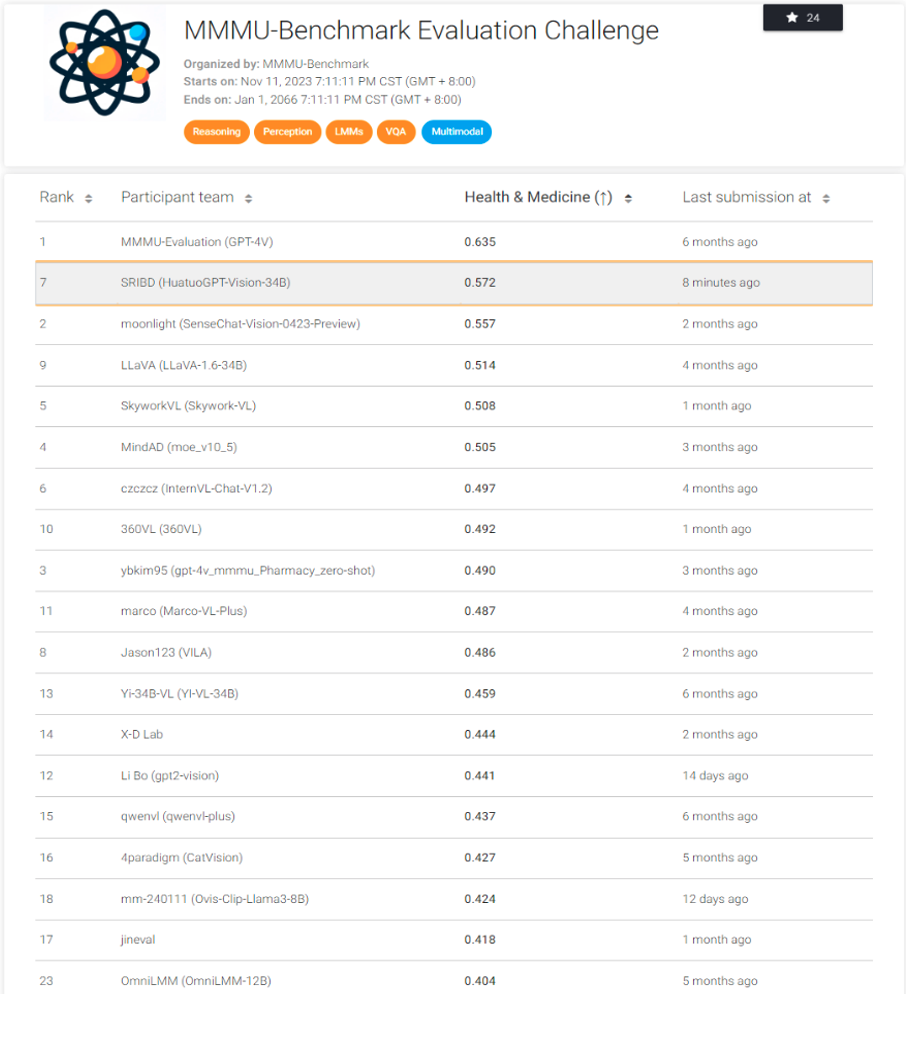 2024年七月份,華佗GPT的多模態版本在主流的MMMU多模態評測集的健康醫療賽道(MMMU Health & Medicine)上,華佗GPT在所有35個模型中取得了總排名第二(僅次于GPT-4v),開源模型中排名第一的優異表現