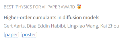 周凱教授近年來研究成果斐然,屢次獲得國際權威期刊和學術會議認可。其論文《Higher-Order Cumulants in Diffusion Models》榮獲最佳“Physics for AI”論文獎(NeurIPS 2024 ?Workshop),該獎項不僅彰顯周凱教授研究的創新性與跨學科特性,更凸顯他在人工智能與物理學融合研究領域的卓越貢獻。