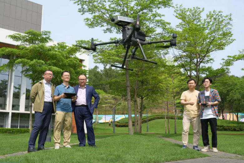 趙俊華教授(左)與同學們在使用無人機收集數據