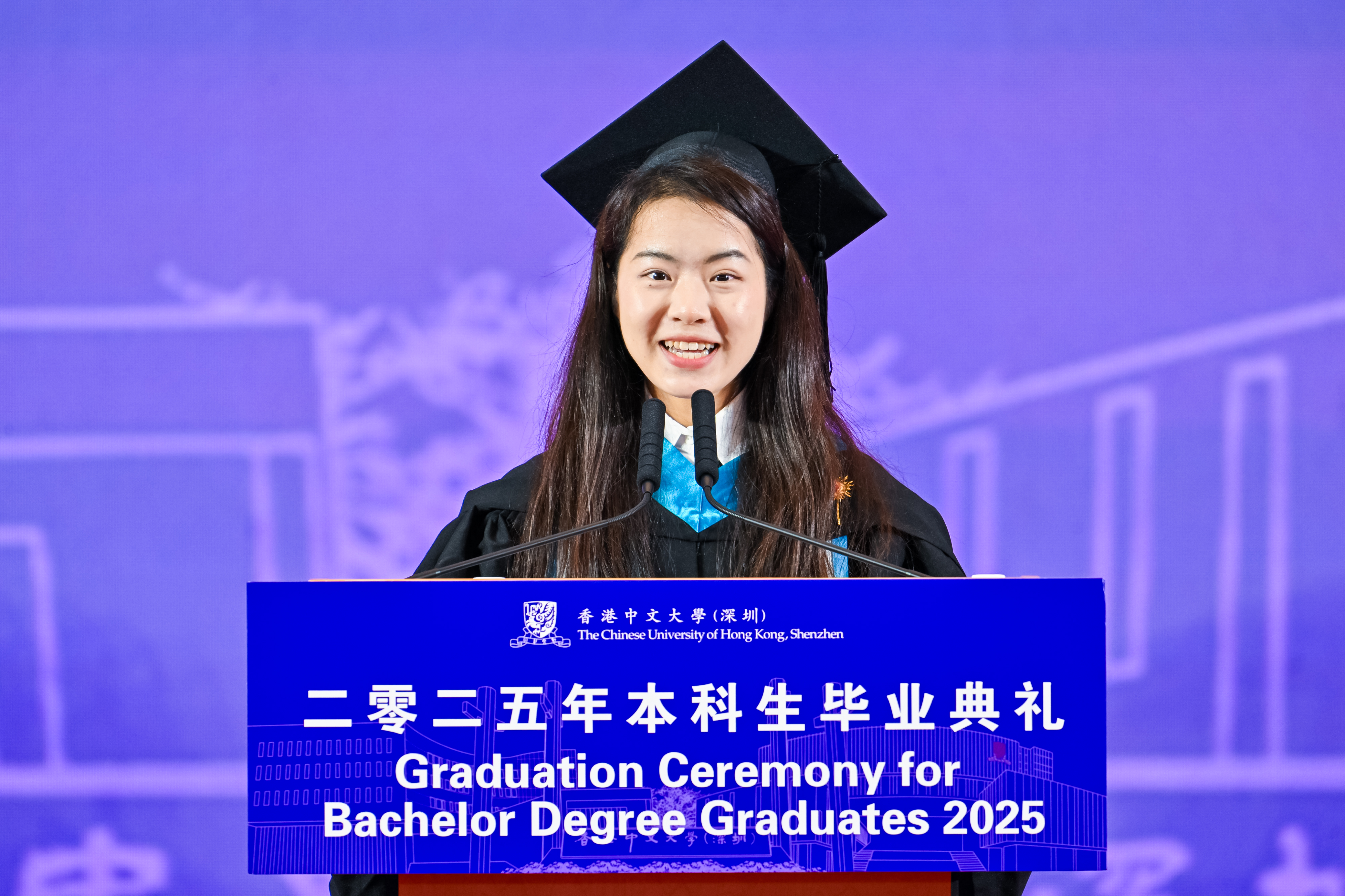 來自學(xué)勤書院、經(jīng)管學(xué)院的畢業(yè)生徐藝凌作為畢業(yè)生代表發(fā)表了感言。她分享了在港中大(深圳)四年求學(xué)時光里沉淀下來的三點體悟:追逐熱愛,認清邊界,結(jié)伴同行。“首先,我找到了熱愛。無論是破解商業(yè)難題、投身社會公益,還是站在聚光燈下演繹角色,我都找到了心之所向。這份自由探索的勇氣與追逐熱愛的底氣,正是港中大(深圳)贈予我最珍貴的禮物。第二,我學(xué)會了認清邊界。向內(nèi)審視,邊界能助我明晰自身優(yōu)劣;向外求索,邊界為我指明了突破的方向。第三,我遇見了我的同行者。在港中大(深圳),我結(jié)交了許多推心置腹的摯友。他們激勵我前行,鞭策我成長,也始終是我最堅實的后盾。”