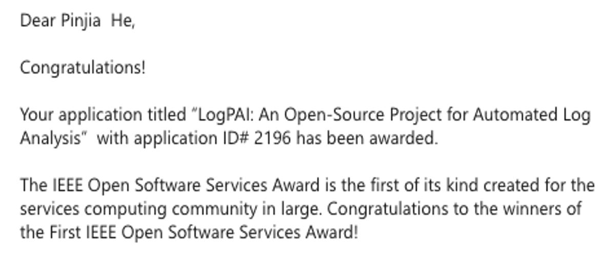 截至目前,LogPAI在開源軟件平臺GitHub上被收藏6000余次,并被超過450個學界業(yè)界知名組織下載8萬余次。2022年5月,LogPAI榮獲第一屆IEEE開源軟件服務獎(IEEE Open Software Services Award)。