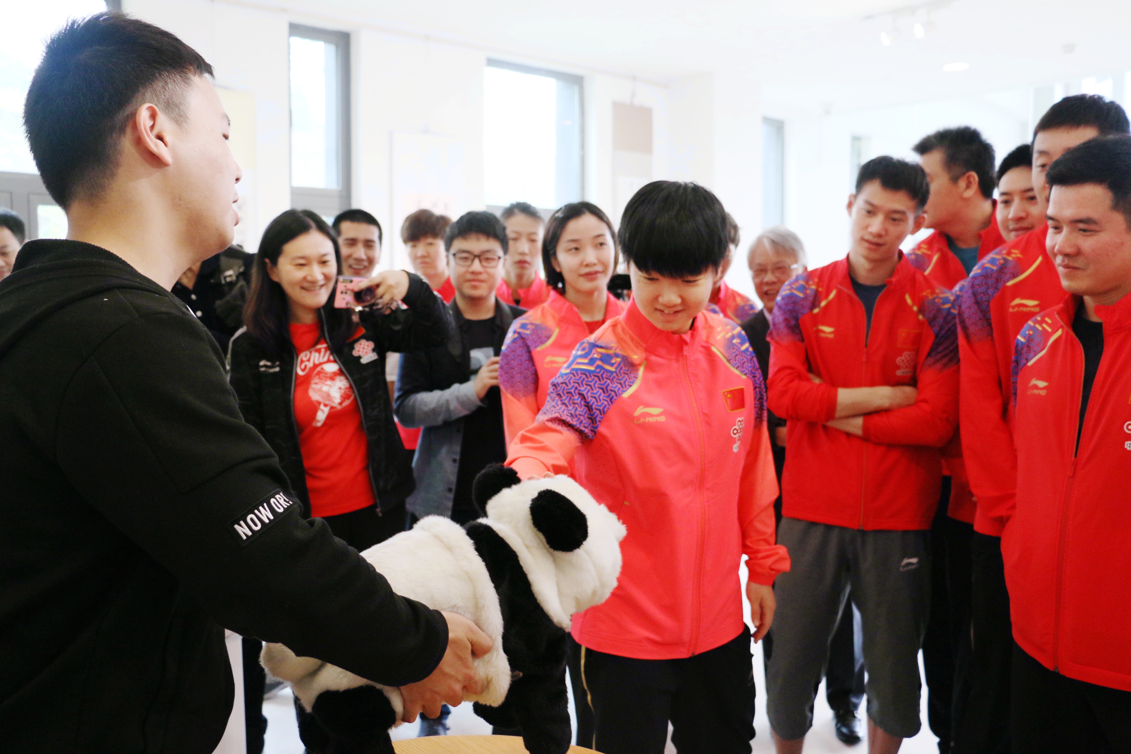 ? ? ? ? 致辭結束后,朱世平教授向來訪的國乒隊贈送校長徐揚生教授的書法作品——“中國乒乓世界無雙”,女子乒乓球隊主教練李隼代表國乒隊接受贈禮,并回贈國乒隊簽字球拍。之后,國乒隊與師生代表合影留念。
