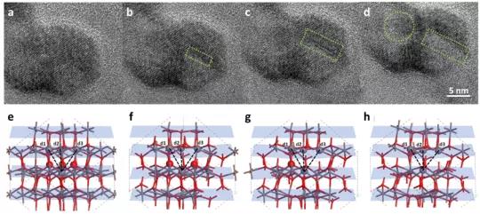 ▲圖2.(a-d)原位環境電鏡觀測黑色氧化銦的形成過程,a-d為0min,5min,10min和20min。淺綠色框為無定型化部分。(e-h)DFT模擬失去氧原子無定型化和可能發生的局部晶格擴張。
