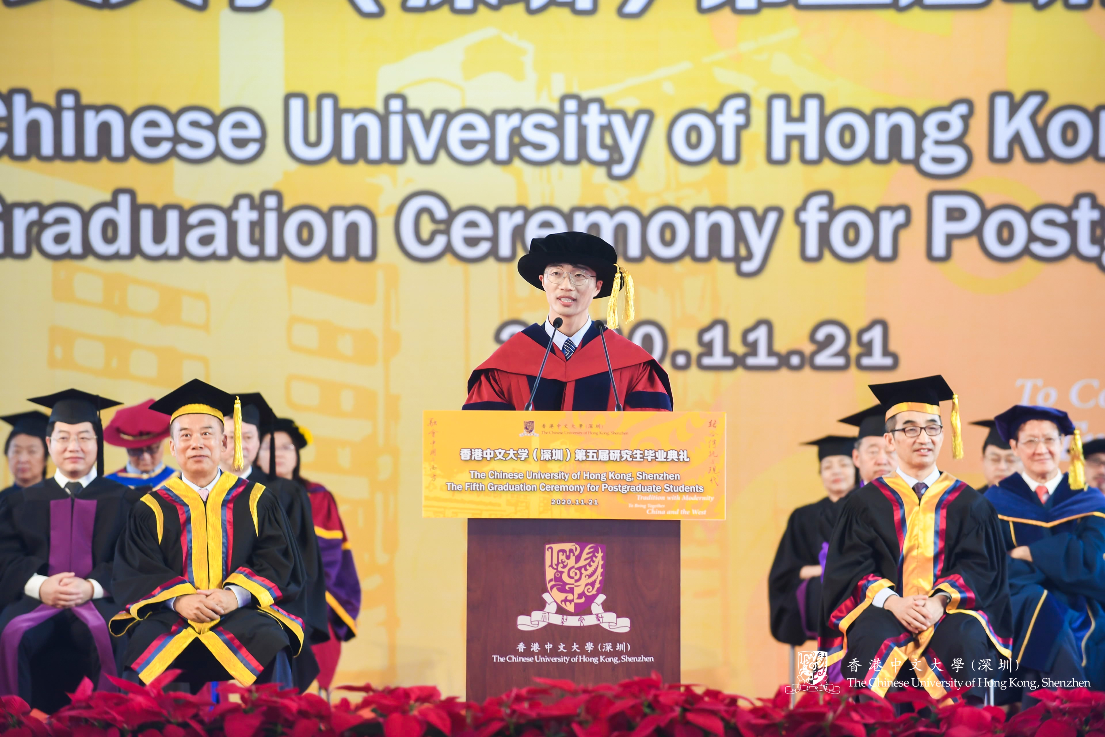 感謝香港中文大學(xué)(深圳)的培養(yǎng),人生中最美麗的事情就是“遇見”,感謝在合適的時(shí)間、合適的地點(diǎn),我們相遇在一起。今天我們雖然各奔東西,但明天我們一定會(huì)帶著各自的成績(jī)常回母校看看;感謝我們的親朋好友一路的陪伴,你們的包容、支持和鼓勵(lì)成就了現(xiàn)在的我們。我們也會(huì)用未來更大的成就告訴你們,“一切的等待都是值得的”;感謝在成長(zhǎng)的重要階段,我們相聚在了深圳。