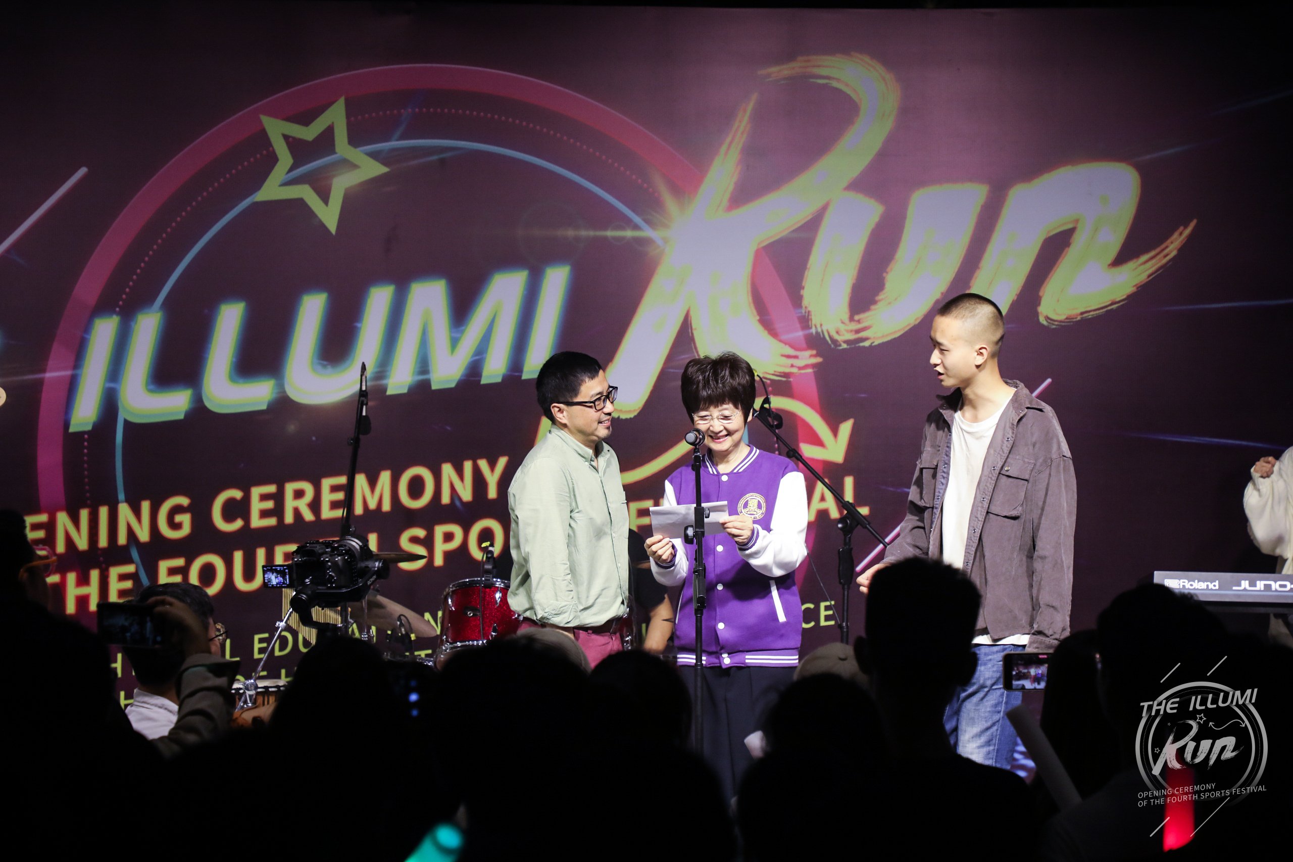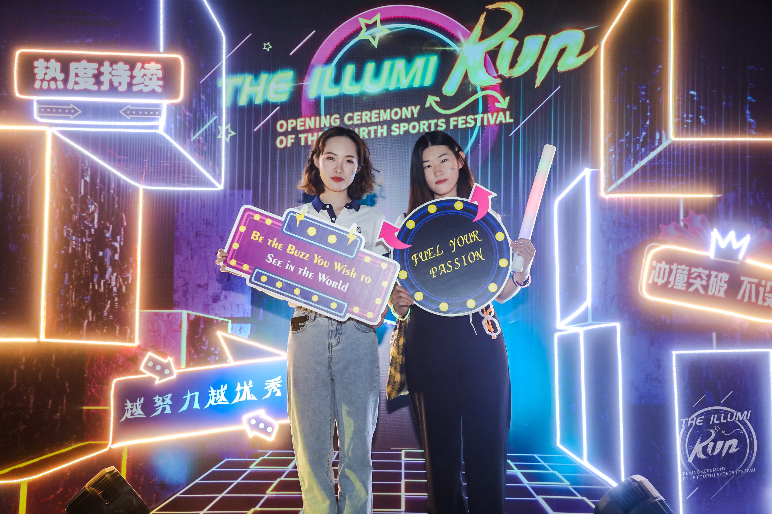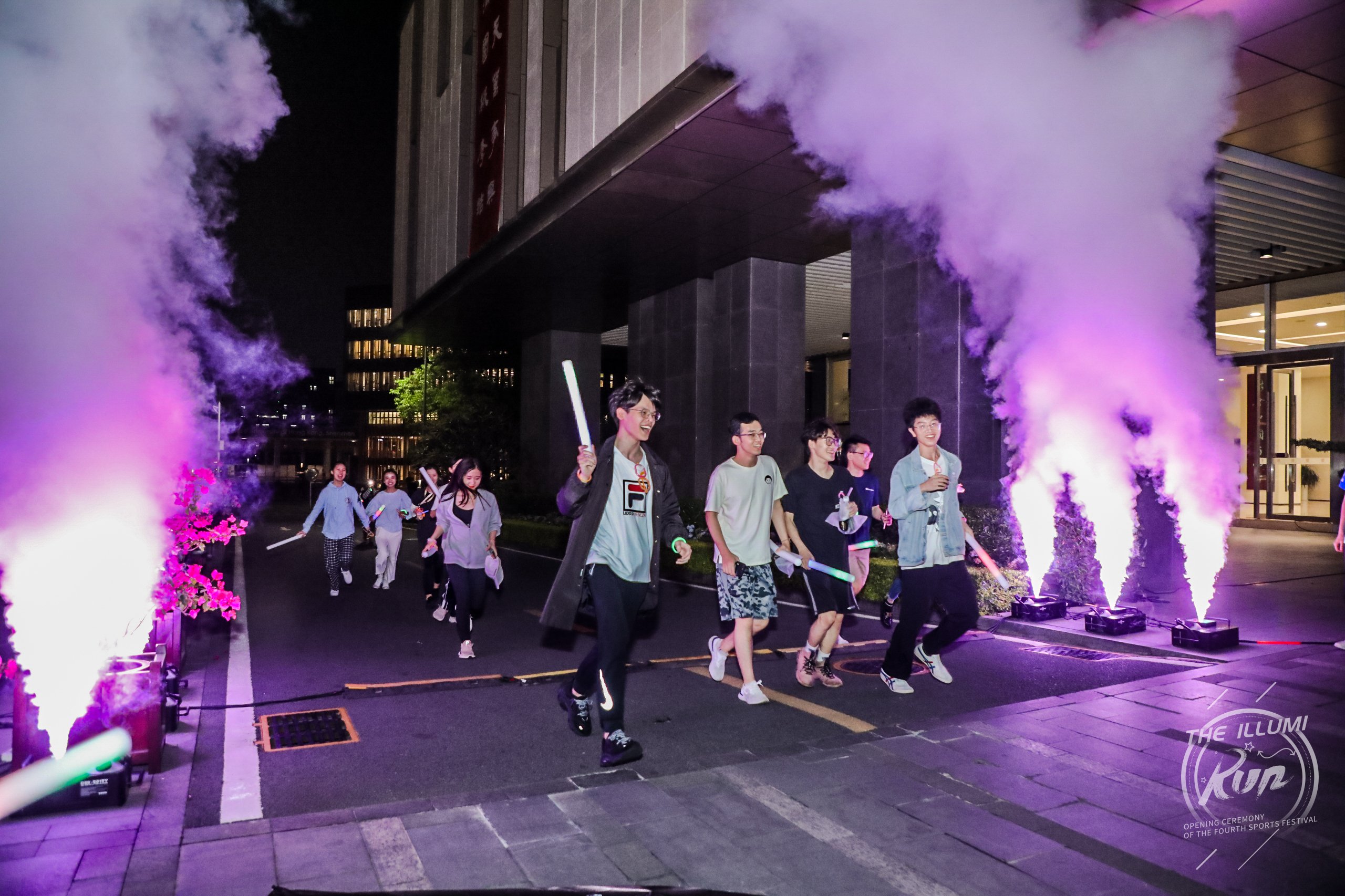 簡短的熱身環節后,現場師生移步到教學樓A、B之間的熒光拱門處,隨著顧陽教授手中發令汽笛的一聲長鳴,穿戴好熒光裝備的人們歡樂開跑,標志著第四屆體育節正式開幕。