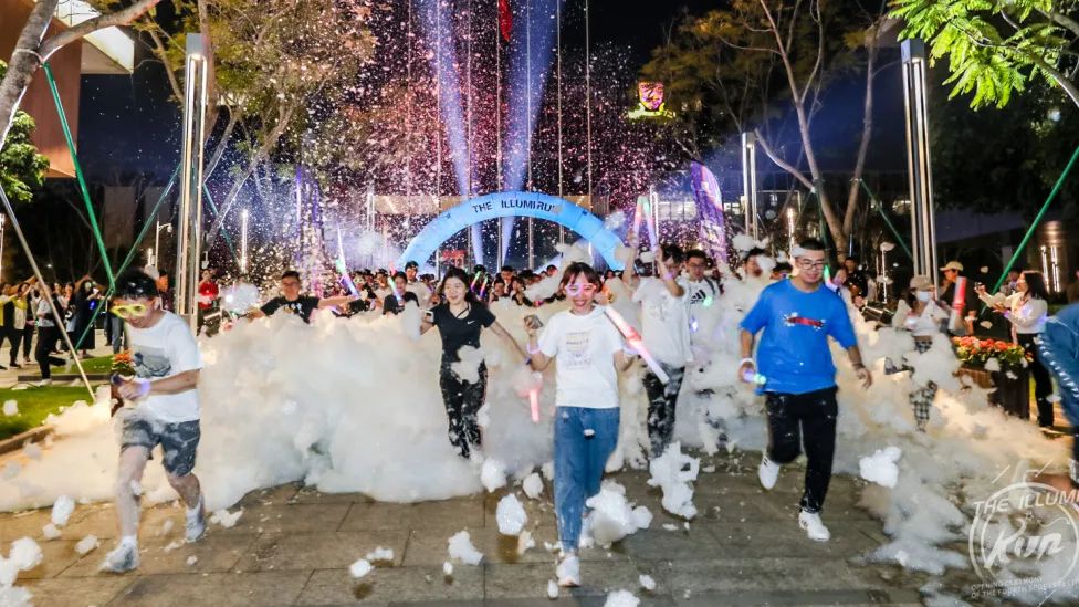 在光線的交錯掩映下,噴向空中的熒彩泡沫洋洋灑灑飛散在空中,又如雪般飄落,匯成一片浪漫的泡沫海洋。