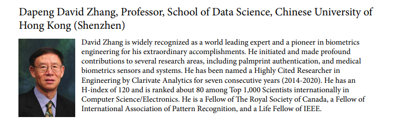 張大鵬教授是香港中文大學(深圳)校長講座教授、深圳市人工智能與機器人研究院(AIRS)計算機視覺研究中心主任。他是國際圖像和圖形學報(IJIG)以及 Springer 國際生物識別叢書(KISB)的創始人和主編,30多年來一直從事模式識別,圖像處理以及生物特征識別研究,是掌紋識別、中醫四診量化及人臉美學等研究領域的開創者和領軍人。其研究成果曾多次獲獎,如中韓授予的發明金獎及特殊金獎、日內瓦發明展銀獎,以及香港特別行政區最高科學技術獎項“裘槎(Chroucher Foundation)優秀科研者”獎等。張教授已出版了20多部相關專著,400余篇國際期刊論文和40多項美國、日本、香港特別行政區、中國專利。2014-2020年,他連續七年被 Clarivate Analytics (科睿唯安)列為“高被引科學家”。