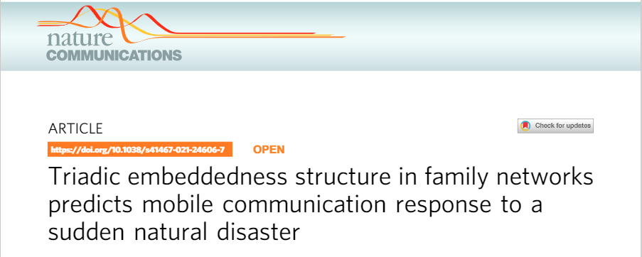 Jia et al. (2021) Triadic embeddedness structure in family networks predicts mobile communication response to a sudden natural disaster. Nature Communications 12, 4286.