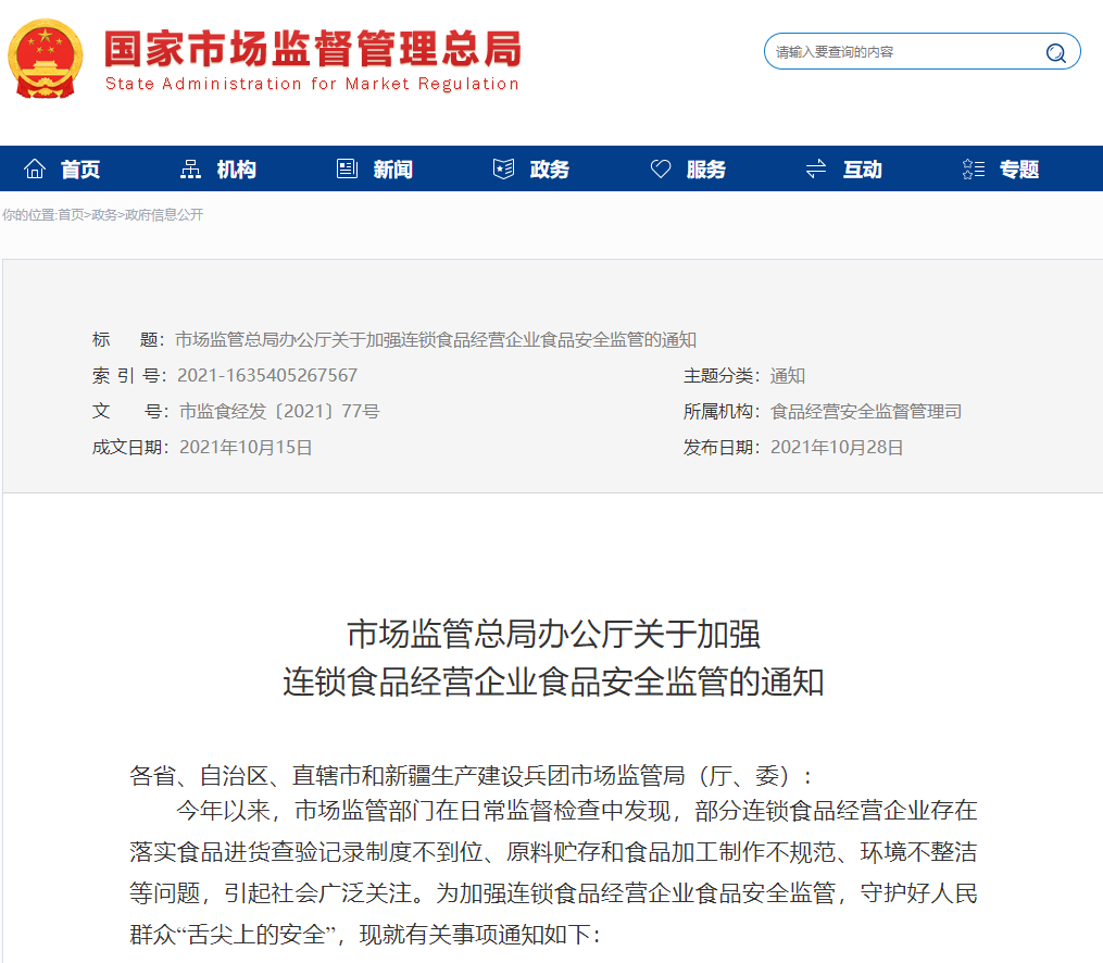 市場監管總局網站發布關于加強連鎖食品經營企業食品安全監管的通知