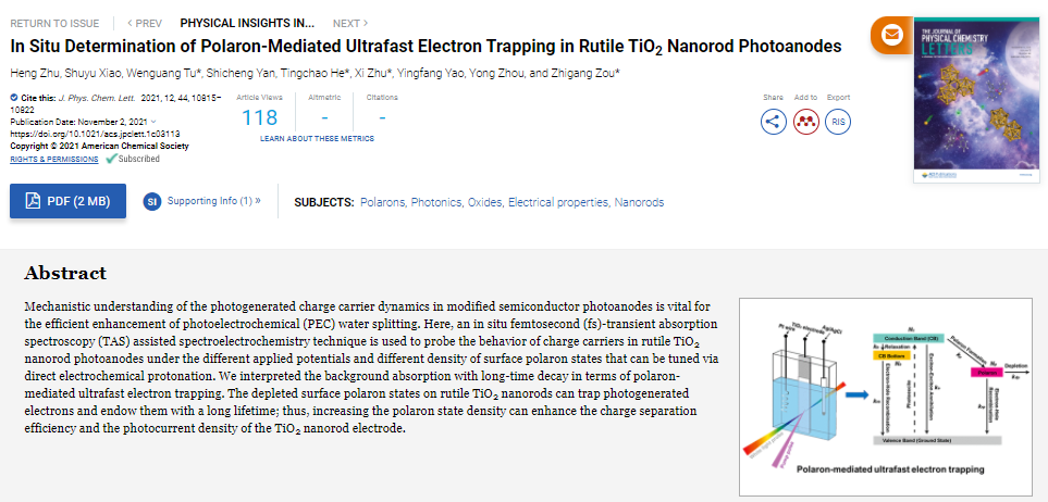 近日,香港中文大學(深圳)理工學院的鄒志剛院士、涂文廣教授和朱熹教授合作在《Journal of Physical Chemistry Letters》發表題為In Situ Determination of Polaron-Mediated Ultrafast Electron Trapping in Rutile TiO2 Nanorod Photoanodes的研究成果。