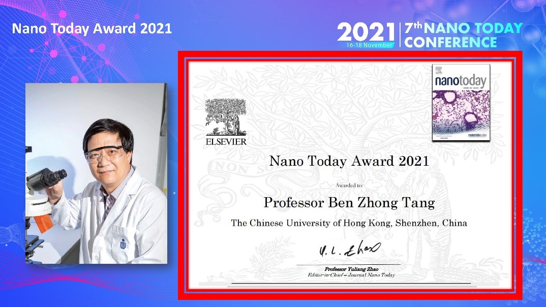 ? ? ? ?11月16日,中國科學院院士、香港中文大學(深圳)理工學院院長唐本忠教授在第七屆Nano Today Conference中榮獲2021 Nano Today Award,以表彰其在納米結構材料領域的開創性研究。值得注意的是,唐本忠教授是中國首位榮獲該獎項的科學家。