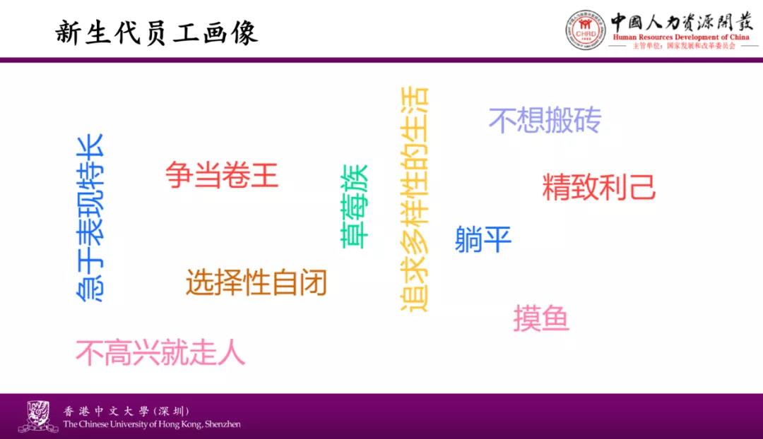 講座伊始,管延軍教授借用當(dāng)下的網(wǎng)絡(luò)熱詞,對(duì)新生代員工的特點(diǎn)進(jìn)行了概括。他認(rèn)為,爭(zhēng)當(dāng)“卷王”、躺平、選擇性自閉、草莓族這些熱詞背后的現(xiàn)象,反映出新生代員工的“自我中心化”和“多極化”的特點(diǎn)。