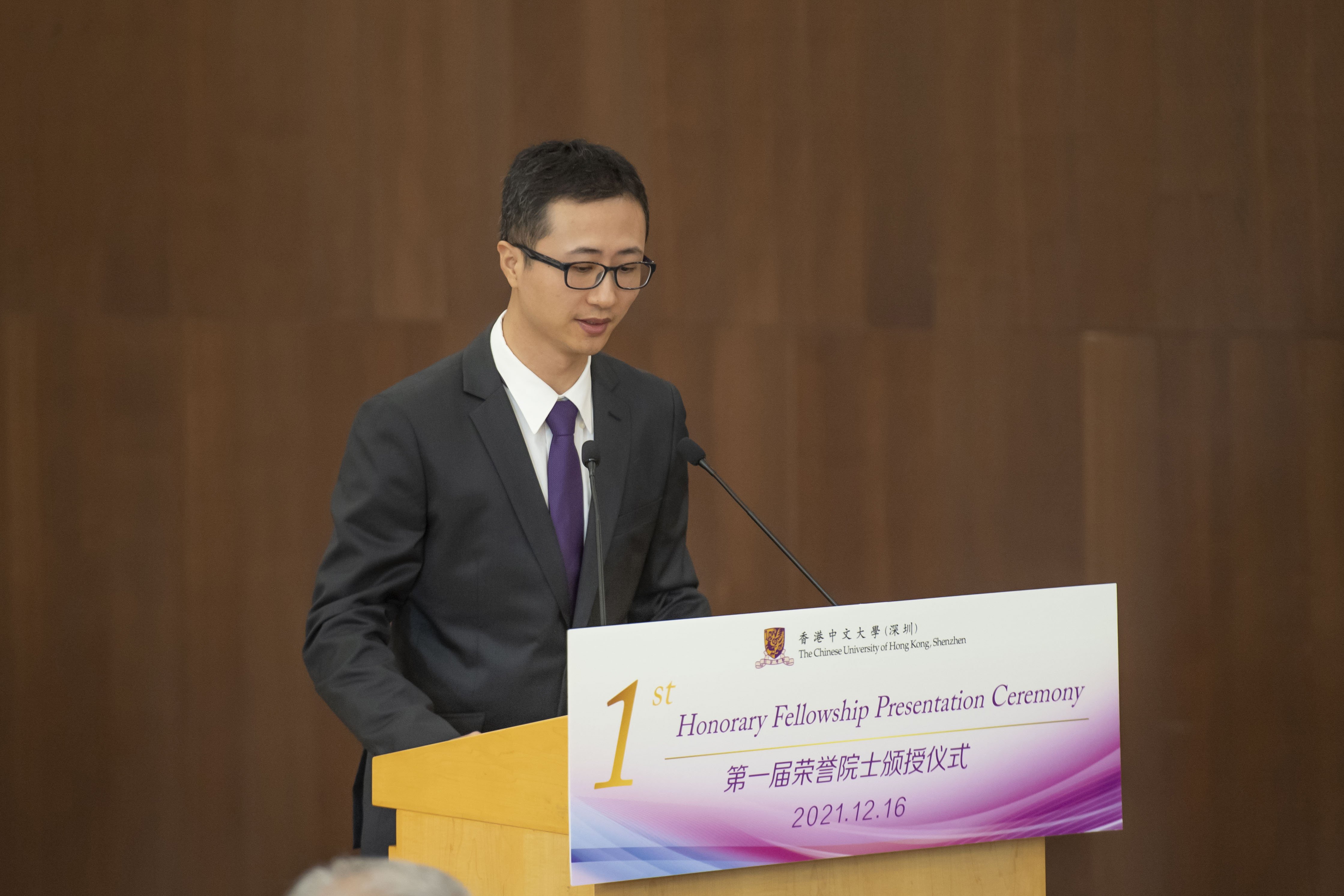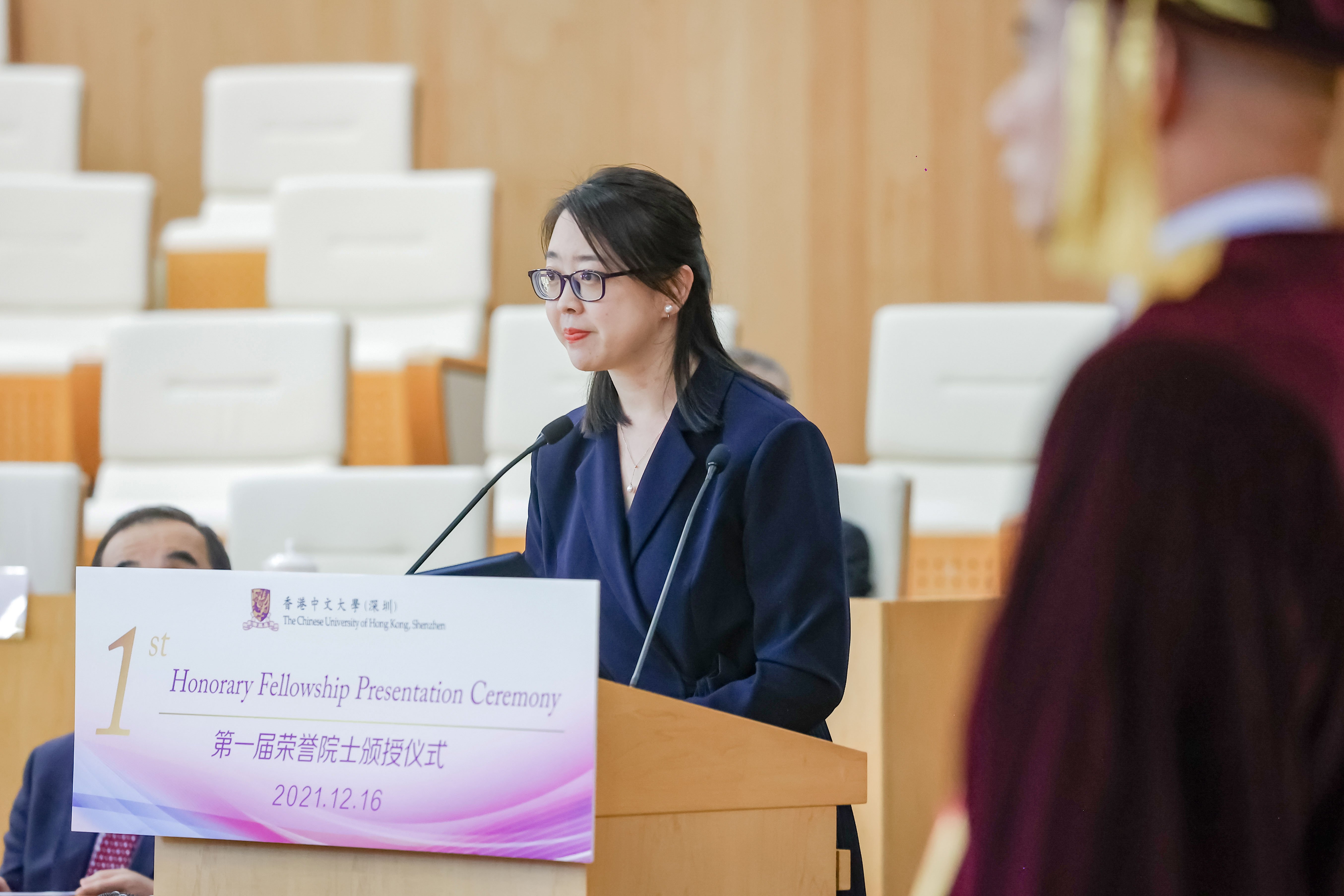 ? ? ? ?榮譽院士授予儀式由香港中文大學(深圳)副校長羅智泉教授主持,儀式上,香港中文大學(深圳)教師侯朔炤、趙璞嵩、林成川、張齊迎分別宣讀劉遵義教授、賴海民先生、鄧學勤先生以及楊祥波先生贊辭,由校長徐揚生教授分別向四位杰出人士頒授榮譽院士證書及紀念牌。由于疫情原因,劉遵義教授今天未能出席儀式。楊祥波先生遺憾離世,楊祥波先生家人楊黃雪蓉女士和楊題維先生代為領取榮譽院士證書、紀念牌及禮袍。香港中文大學(深圳)主管人員及師生代表,四位杰出人士的親友及嘉賓出席并見證了頒授儀式。