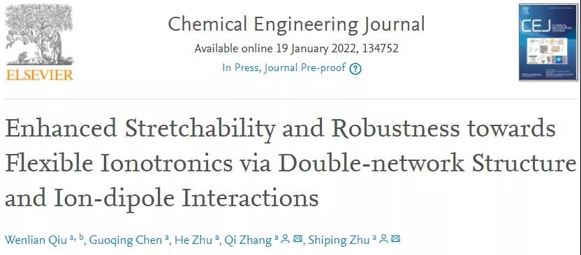 近日,香港中文大學(xué)(深圳)理工學(xué)院朱世平教授、張祺助理教授團隊在《Chemical Engineering Journal》期刊上發(fā)表題為“Enhanced Stretchability and Robustness towards Flexible Ionotronics via Double-network Structure and Ion-dipole Interactions”的文章。