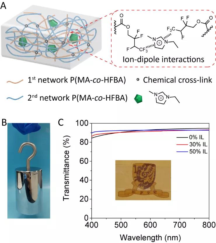 在該工作中,作者采用光聚合獲得交聯(lián)六氟丁基丙烯酸酯與丙烯酸甲酯的共聚物P(MA-co-HFBA)為基體材料,通過聚合-溶脹-聚合-離子液體浸泡的方法構(gòu)筑雙網(wǎng)絡(luò)聚合物離子凝膠,其中,聚合物側(cè)鏈上電負性較大的CF?基團與離子液體EMITFSI中的咪唑陽離子發(fā)生離子-偶極相互作用,不僅有助于網(wǎng)絡(luò)內(nèi)形成物理交聯(lián)點,也使得兩層網(wǎng)絡(luò)間產(chǎn)生相互作用,從而提高凝膠的力學(xué)性能。所制備的離子凝膠具有優(yōu)異的透明性和力學(xué)強度(圖1)。