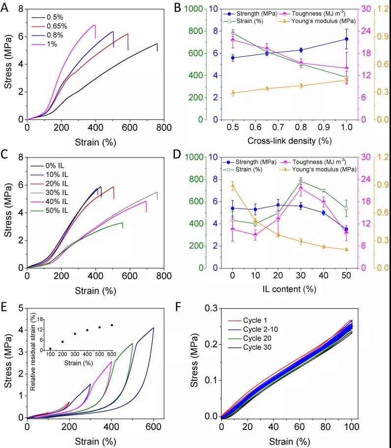 圖2. 離子凝膠的力學(xué)性能表征