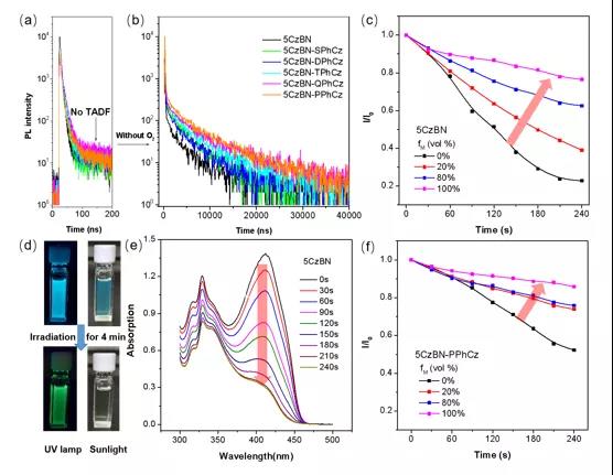 圖2(a)在300 K下N?鼓泡前5CzBN衍生物的PL瞬態(tài)衰減曲線;(b) N?鼓泡后的PL瞬態(tài)衰減曲線;(c) 5CzBN存在下,1, 3-二苯基異苯并呋喃(DPBF)在MeOH / DCM(v:v) = 0%、20%、80%、100%溶液中的分解速率,其中I?和I分別為在光照時(shí)間為0及其他時(shí)間下DPBF在410 nm處的吸光度;(d) 5CzBN與DPBF的混合物在DCM溶液中照射前后的照片(左側(cè):UV照射下,右側(cè):陽光下);(e) DPBF在5CzBN存在下的紫外可見吸收光譜;(f) 在5CzBN-PPhCz存在時(shí),DPBF在MeOH / DCM(v:v) = 0%、20%、80%、100%的分解速率。