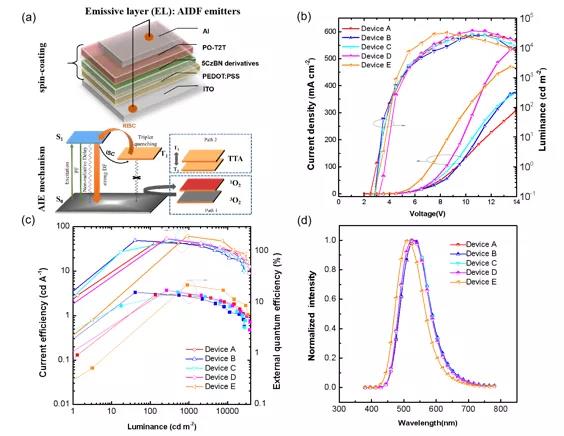 此工作中作者報(bào)道了一類核-殼結(jié)構(gòu)的AIE分子,該類分子可以通過聚集抑制氧氣淬滅和聚集抑制TTA過程來抑制三線態(tài)的非輻射躍遷途徑,最終實(shí)現(xiàn)聚集態(tài)下高效的熒光發(fā)射,固體量子產(chǎn)率為83%(5CzBN-PPhCz)。將其應(yīng)用于溶液法加工的OLED器件,表現(xiàn)出優(yōu)異的器件性能,CIE坐標(biāo)為(0.26,0.50),外量子效率可達(dá)21.8%。這種基于分子核-殼結(jié)構(gòu)的簡(jiǎn)單可視化策略為AIEgens在濕法光電器件領(lǐng)域的應(yīng)用提供了一個(gè)有前途的平臺(tái)。