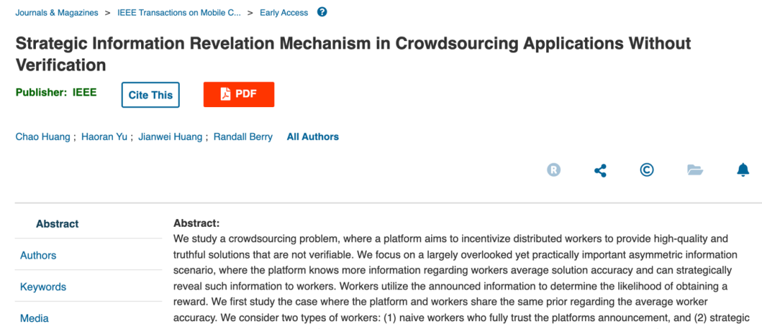 近日,香港中文大學(深圳)理工學院的黃建偉教授在《IEEE Transactions on Mobile Computing》發表題為 “Strategic Information Revelation Mechanism in Crowdsourcing Applications Without Verification” 的文章。